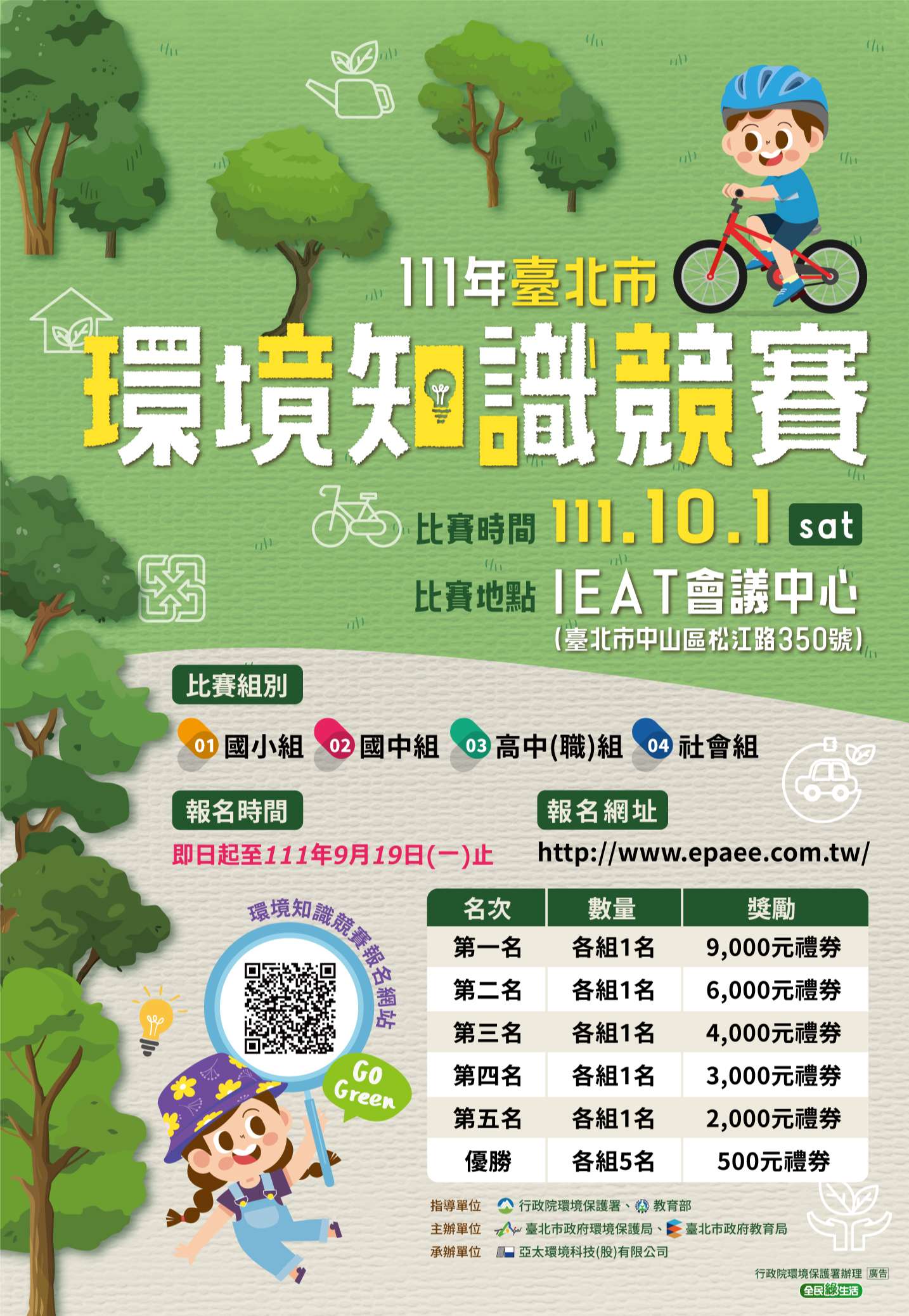 主旨:本市「111年環境知識競賽」訂於111年10月1日(星期六)假IEAT會議中心舉行,惠請本校學生踴躍報名參加,請查照。
