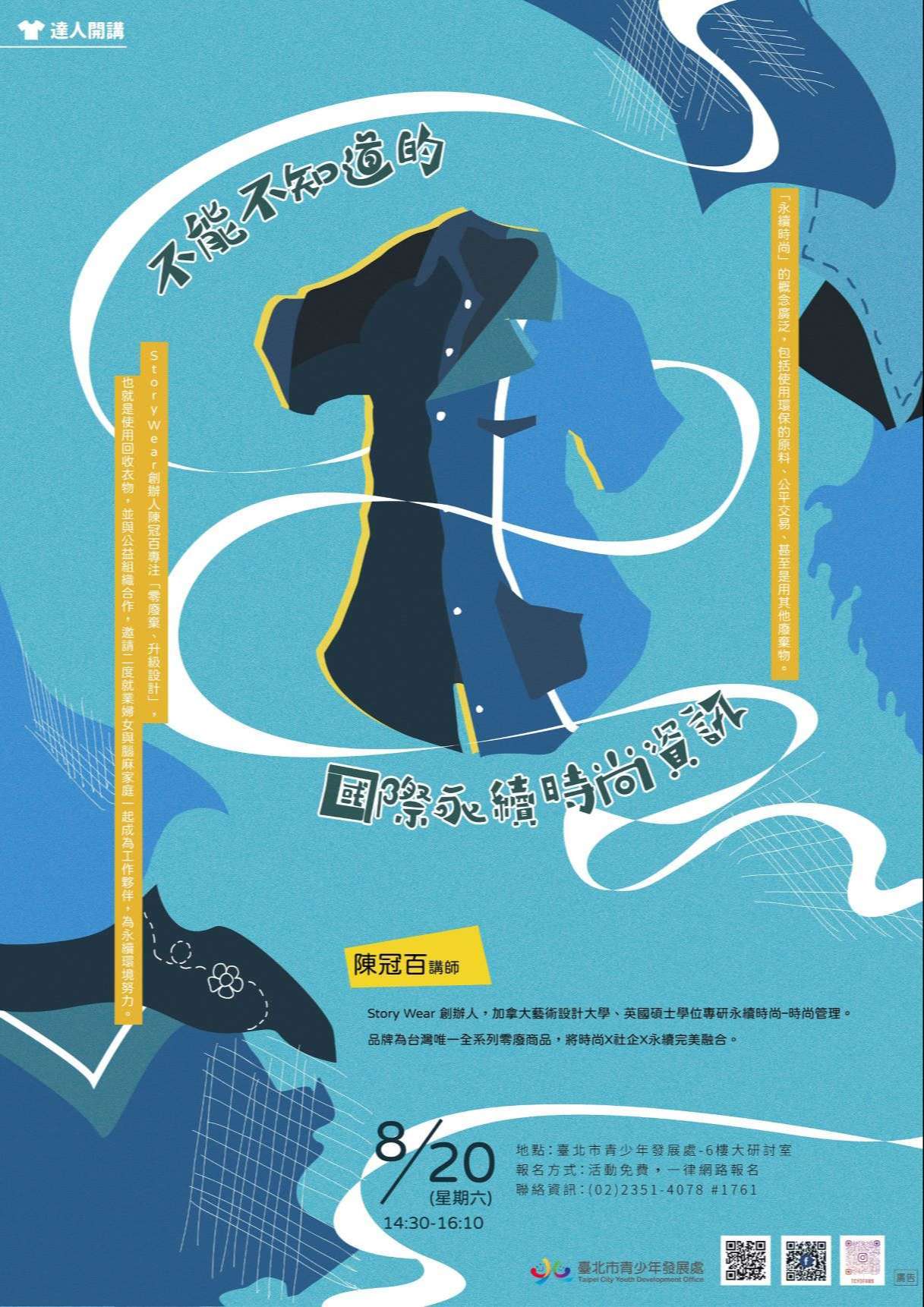 一、經由講師職涯經驗分享,讓年輕學子認識各行各業,藉以了解自身興趣及性向,進而找到未來的道路與建立自我價值;Story Wear 創辦人陳冠百老師分享她踏上永續時尚零廢棄的心路歷程與過程。