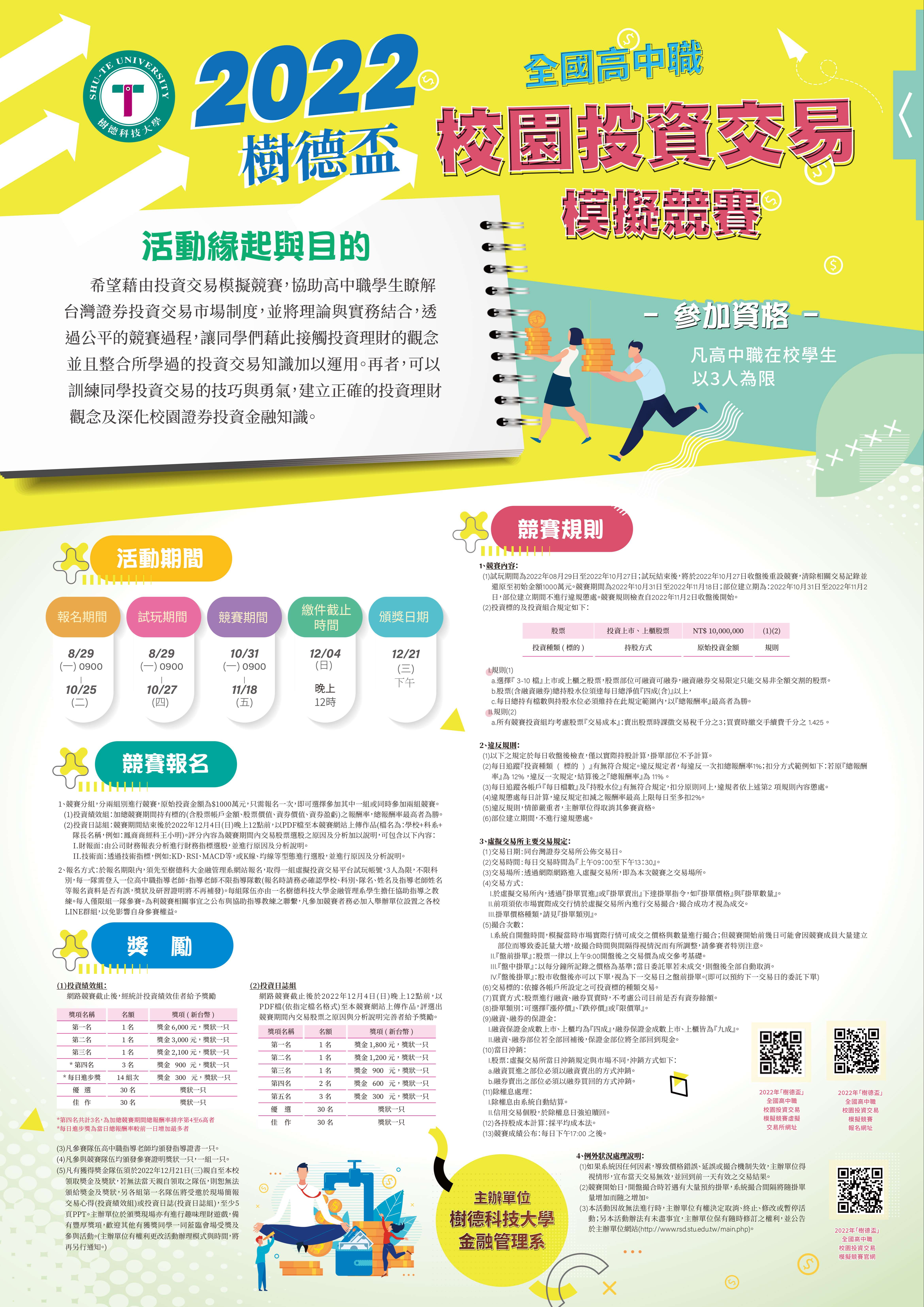 一、2022「樹德盃」全國高中職校園投資交易模擬競賽,由本校金融管理系主辦,將於2022年8月29日至2022年10月25日開放報名。