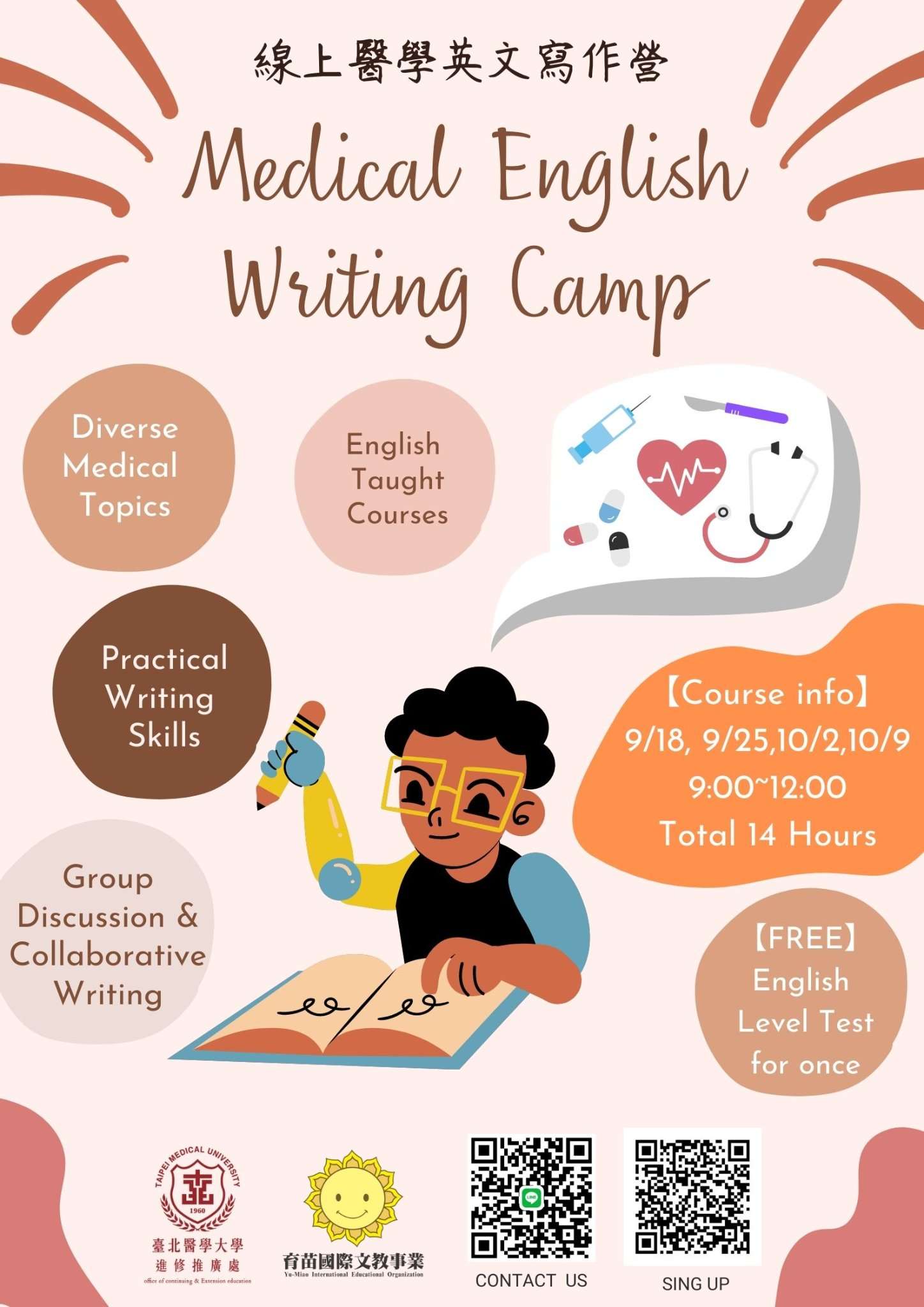 一、為促進學生對醫學領域之認知並有效提升英文實力,臺北醫學大學進推處結合本校專業醫療師資、國際師資及專業英文教育講師資源,採用營隊設計深入淺出的英文醫學寫作課程,以遠距教學擴大學生之國際視野,並以實做練習提升其英文寫作能力。