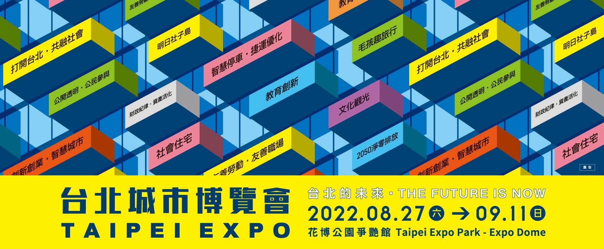 2.2022 台北城博會於8/27-9/30以線上線下爭艷館混合展出,以「台北的未來」為主軸,透過「永續發展」、「城市再生」、「打開台北」、「共融社會」、「創新創業」、「智慧城市」六大主題展現未來台北新風貌。