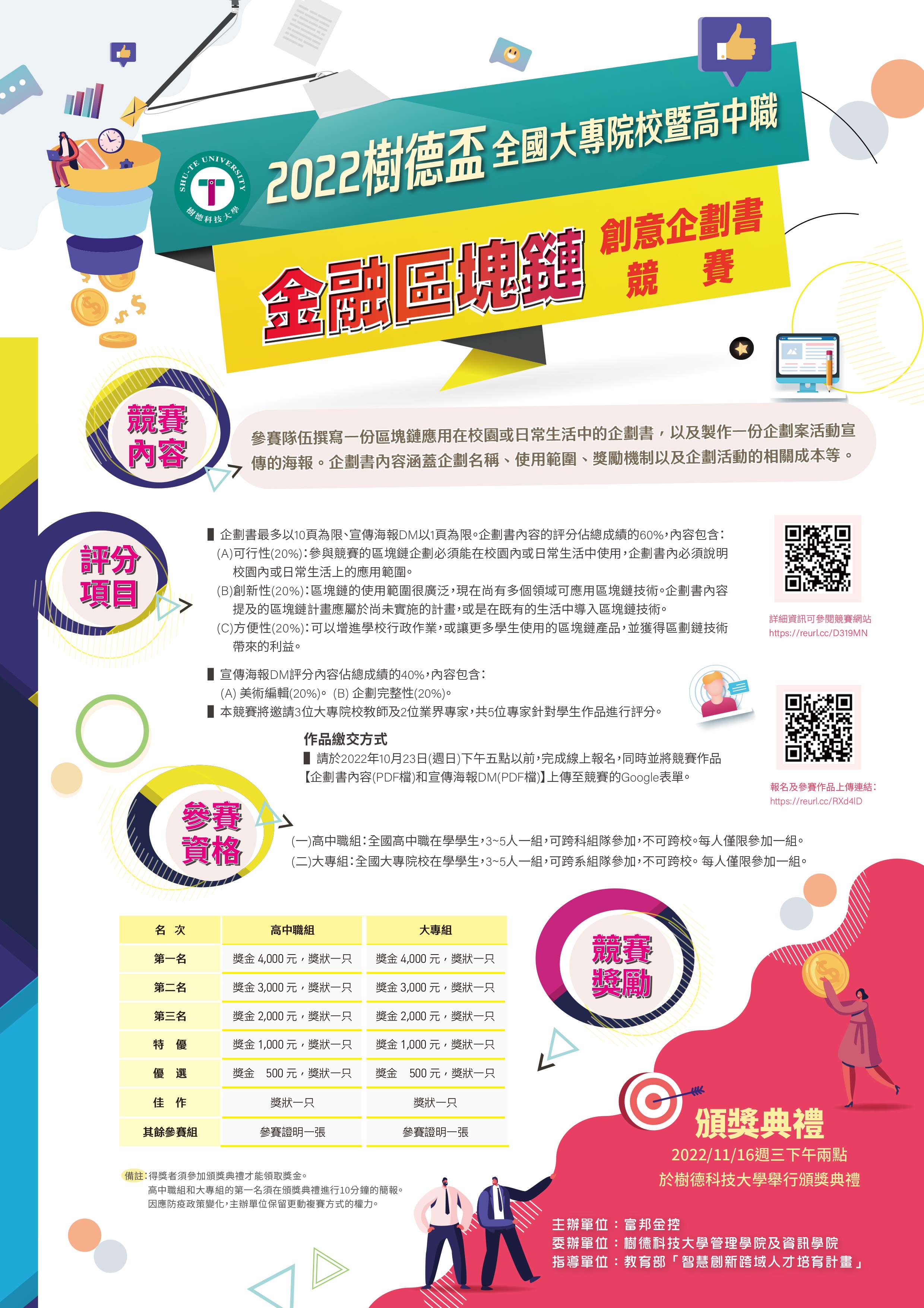 一、為激發學生創意,更廣泛的應用區塊鏈技術,本校金融管理系舉辦2022「樹德盃」全國大專院校暨高中職金融區塊鏈創意企劃書競賽。 二、作品繳交期限:2022年10月23日(日)下午17:00前完成報名,並將競賽作品上傳至競賽報名表單(網址)。 三、頒獎典禮:2022年11月16日(三)下午14:00於樹德科技大學舉行。 四、競賽海報:如附件一。 五、競賽企劃書指引:如附件二。 六、競賽相關資訊請參閱