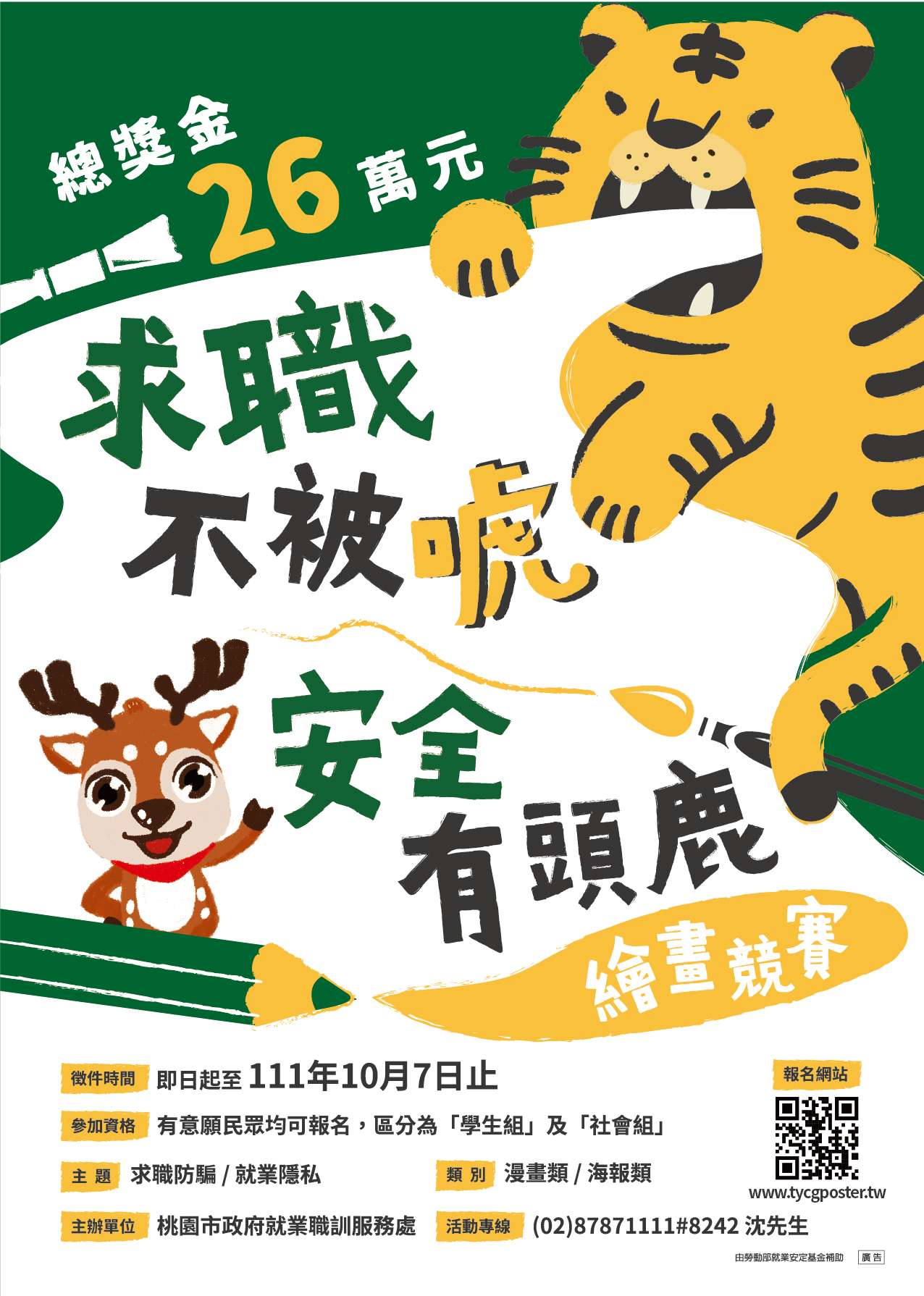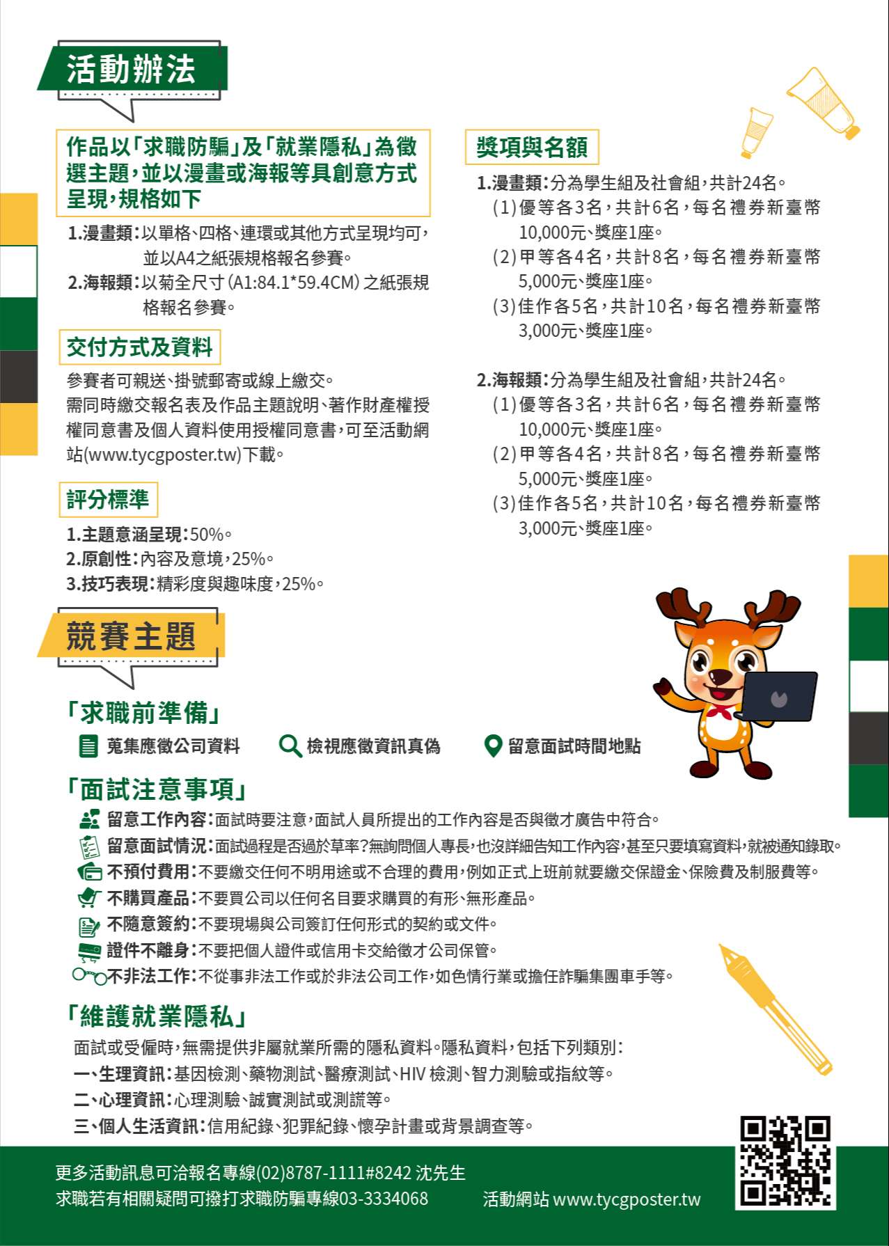 一、為加強「求職防騙暨就業隱私」觀念及法令之宣導,協助民眾了解求職時防騙重要性,避免雇主要求提供與工作無關之隱私資料而觸法,本處自即日起至111年10月7日(星期五)止辦理「求職不被唬,安全有頭鹿-求職防詐騙創意大募集漫畫及海報比賽」。 二、旨揭比賽針對「學生組(國內高中職及大專校院學生)」及「社會組」分別徵件,獎項共有優等12名、甲等16名及佳作20名,總獎金高達新臺幣26萬元,惠請鼓勵學生及畢業校友踴躍投稿。 三、更多詳情請至活動官網或本處官網瀏覽最新消息,或逕洽(02)8787-1111分機8242沈先生或(03)3334068本處就業安全課邱先生。