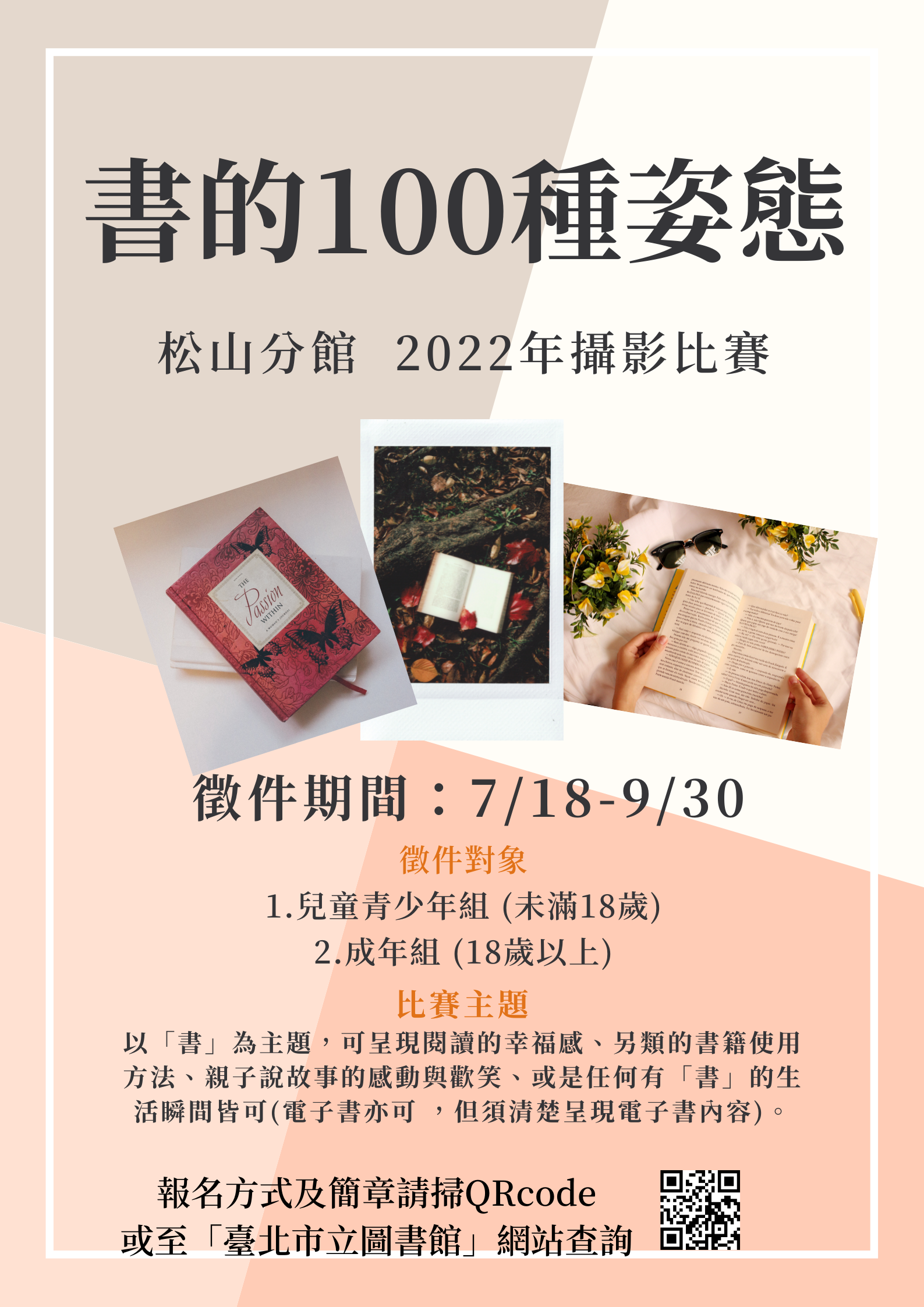 一、為推廣攝影類館藏特色圖書、鼓勵閱讀及培養良好閱讀興趣,松山分館特舉辦2022「書的100種姿態」攝影比賽。收件日期自即日起至111年9月30日止,歡迎貴校教師、攝影社團及學生踴躍參加。