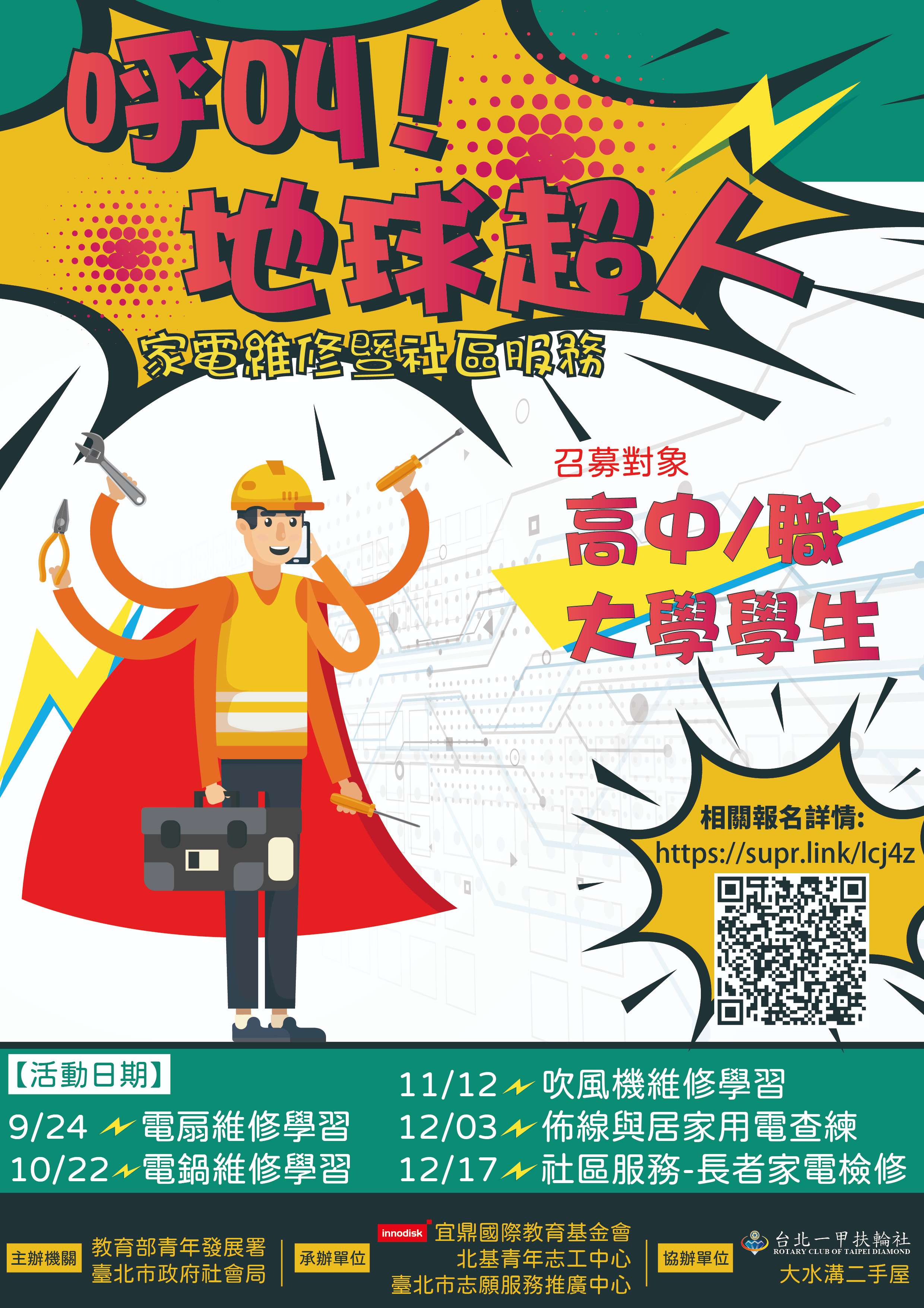 二、為強化青年對於資源再利用的力行,鼓勵青年自行學習簡易家電維修技巧,並將結合社福組織,帶領志工協助關懷獨居長者家戶用電安全。