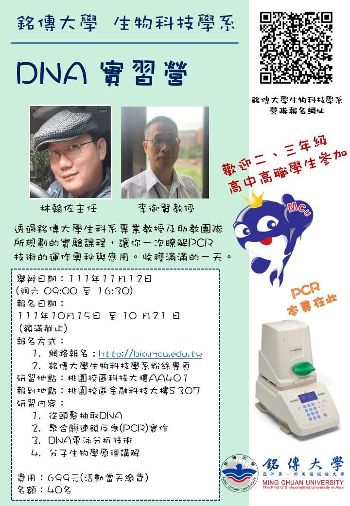 一、活動地點:銘傳大學桃園校區科技大樓四樓實驗室。 二、報名時間:111年10月15日至10月21日,網路報名額滿截止。 三、報名網址:(一)銘傳大學生物科技學系粉絲專頁(二)銘傳大學生物科技學系網頁。 四、活動訊息請參閱附件,歡迎貴校學生踴躍報名參加。 五、聯絡人:生科系金晴嵐,電話03-3507001分機3505。