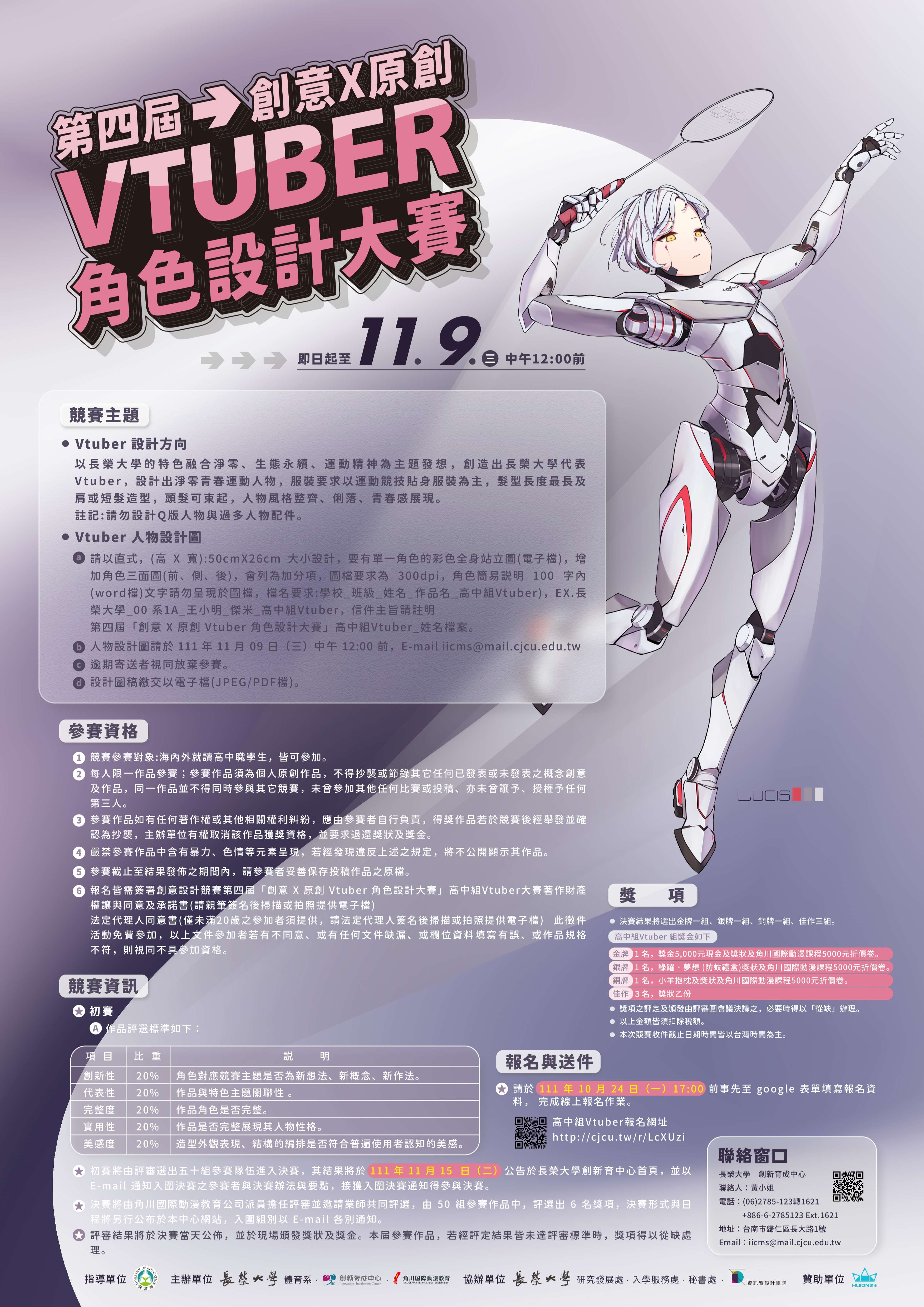一、第四屆「創意X原創Vtuber角色設計大賽」賽事詳細資訊如網頁所示。 二、報名時間:111 年10月24日(星期一)下午17:00前。 三、報名網址:高中組報名。 四、報名聯絡窗口:本校創新育成中心黃小姐,電話:(06)2785123分機1621。