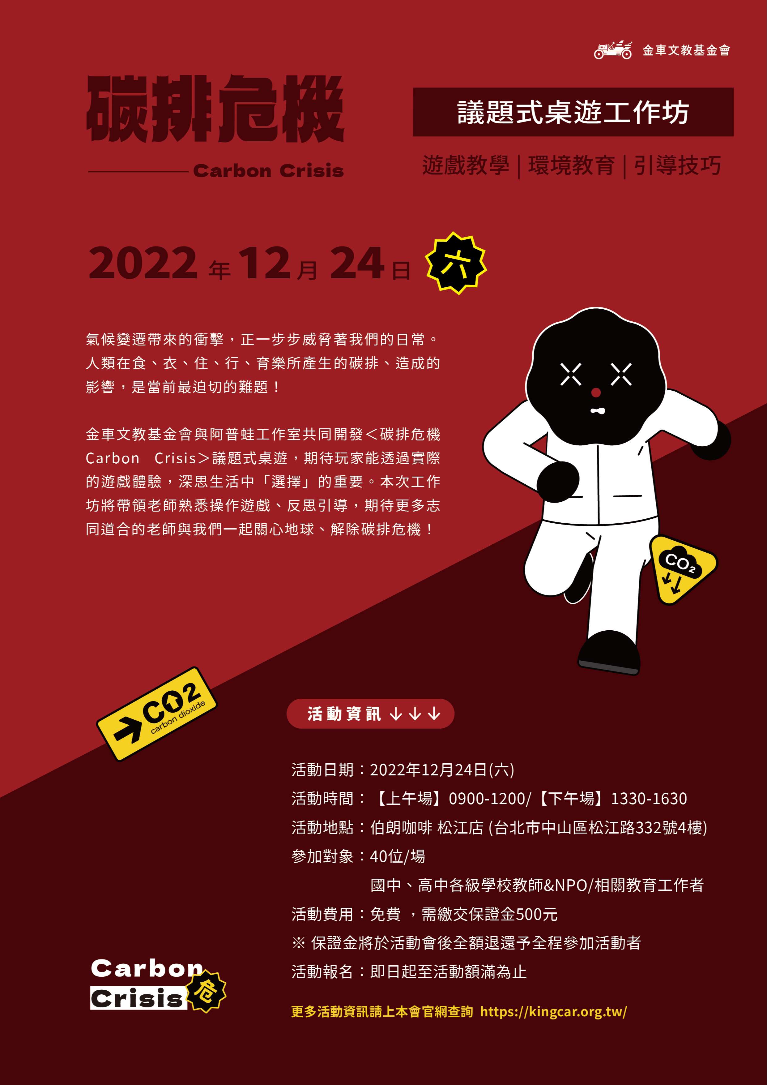 一、金車文教基金會與阿普蛙工作室共同開發<碳排危機Carbon Crisis>議題式桌遊,期待透過實際遊戲體驗,深思生活中「選擇」的重要。本工作坊將帶領老師熟悉操作遊戲、反思引導,期待更多志同道合的老師一起加入我