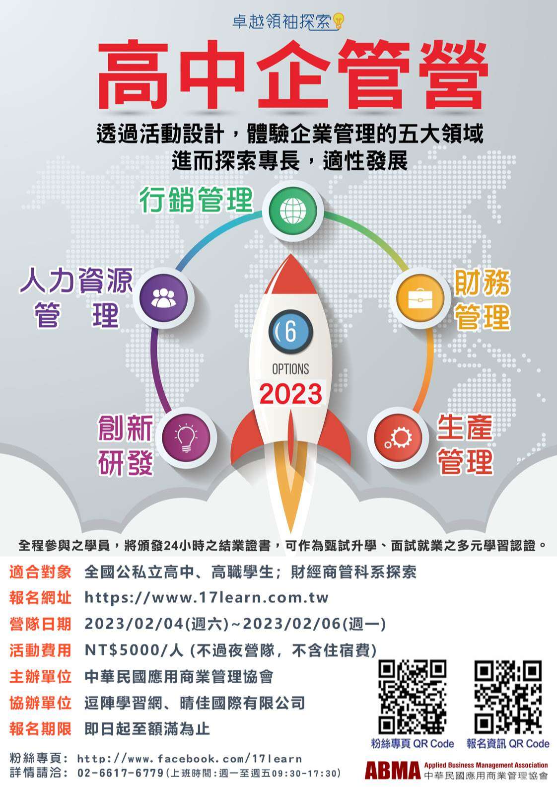 二、營隊宗旨:培養有志於「財經商管」領域發展的高中/高職生及早具備六大基礎核心能力: 問題分析力、人際溝通力、思考決策力、團隊合作力、創新創意力、規劃執行力。將真實的商業經營情境透過互動學習、體驗活動、分享回饋、引導討論的模式,達到探索專長,適性發展的目標。
