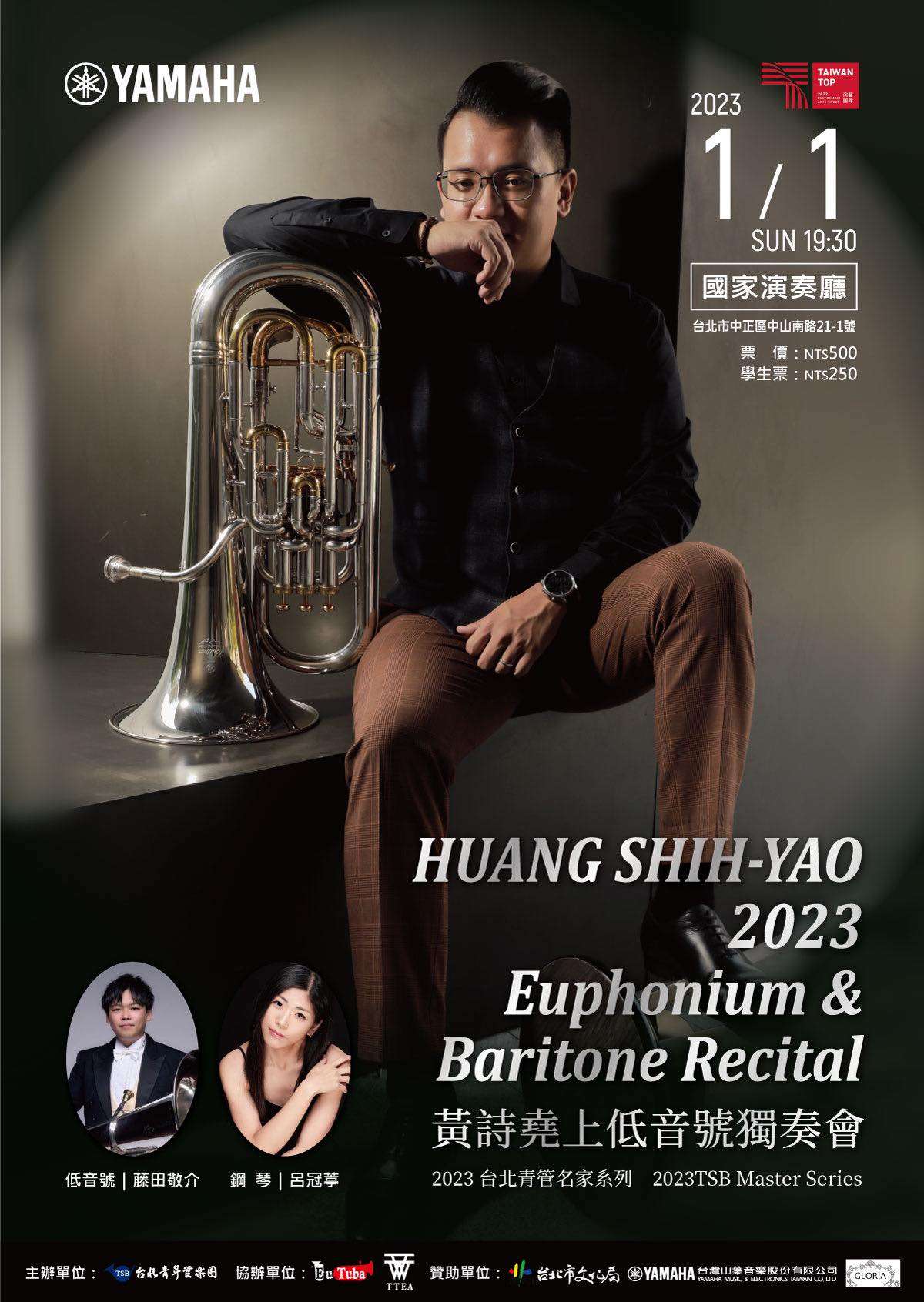 一、2023台北青管名家系列,邀請臺南藝術大學音樂系上低音號講師黃詩堯,攜手留德鋼琴家呂冠葶,國家交響樂團低音號首席藤田敬介帶來一連串華麗炫技的樂曲。 二、旨揭音樂會相關訊息如下: (一)演出時間:112年1月1日 (星期日)晚上7:30 (二)演出地點:兩廳院國家演奏廳(臺北市中正區中山南路21-1號)。 (三)購票請至兩廳院購票系統 ;學生可享5折優惠,請逕洽台北青管樂團經理王先生(02-2322-3654)。 (四)相關音樂會資訊請至台北青年管樂團臉書粉絲專頁查詢。
