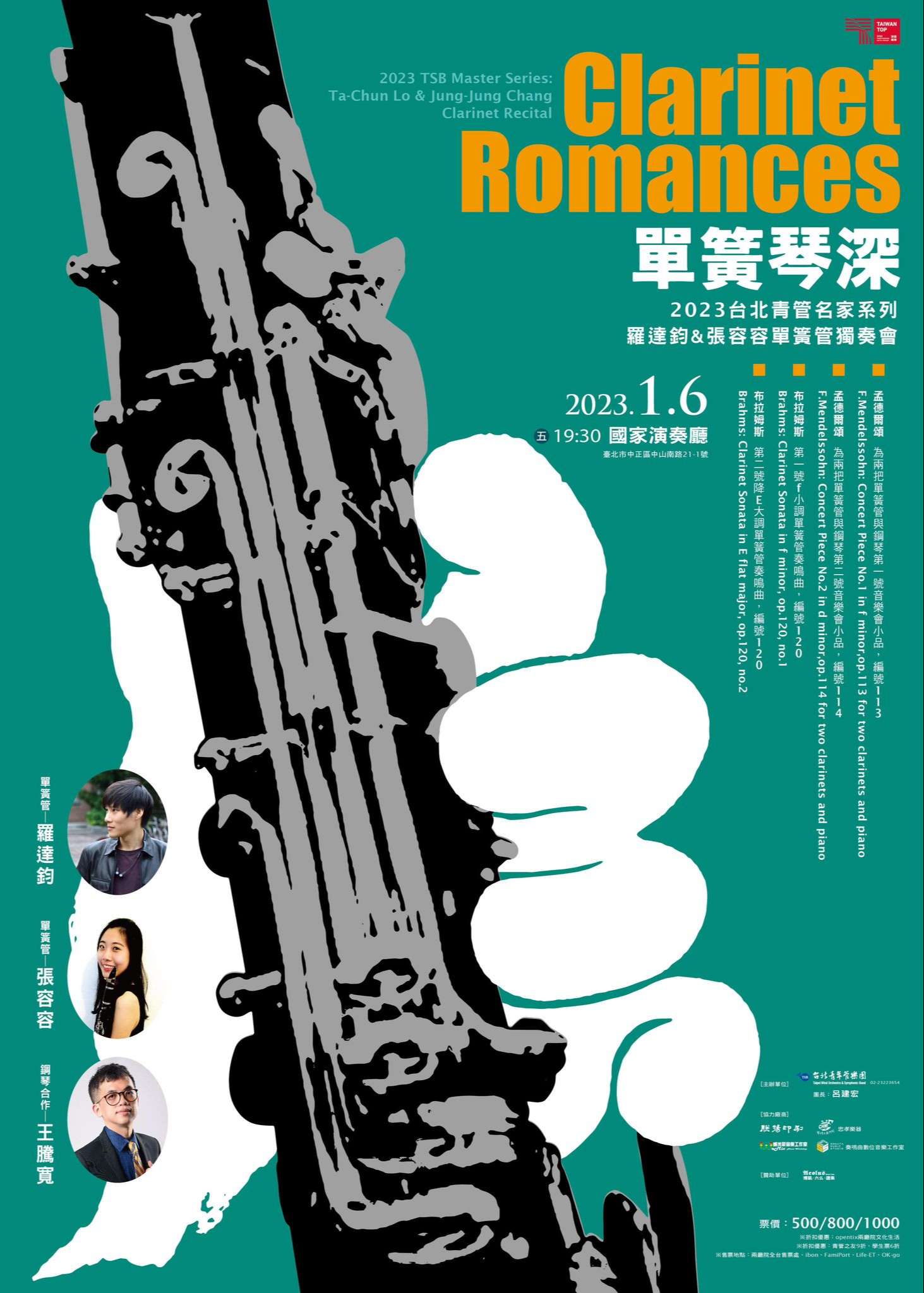 一、2023台北青管名家系列,邀請台北青管2團首席單簧管羅達鈞,與留法單簧管演奏家張容容擔綱獨奏,演奏布拉姆斯2首單簧管奏鳴曲、與孟德爾頌單簧管2重奏與鋼琴2首音樂會演奏曲,讓您深入認識單簧管音樂美好。 二、旨揭音樂會相關訊息如下: (一)演出時間:112年1月6日 (星期五)晚上7:30 。 (二)演出地點:兩廳院國家演奏廳(臺北市中正區中山南路21-1號)。 (三)購票請至兩廳院購票系統;學生可享6折優惠,請逕洽台北青管樂團經理王先生(02-2322-3654)。