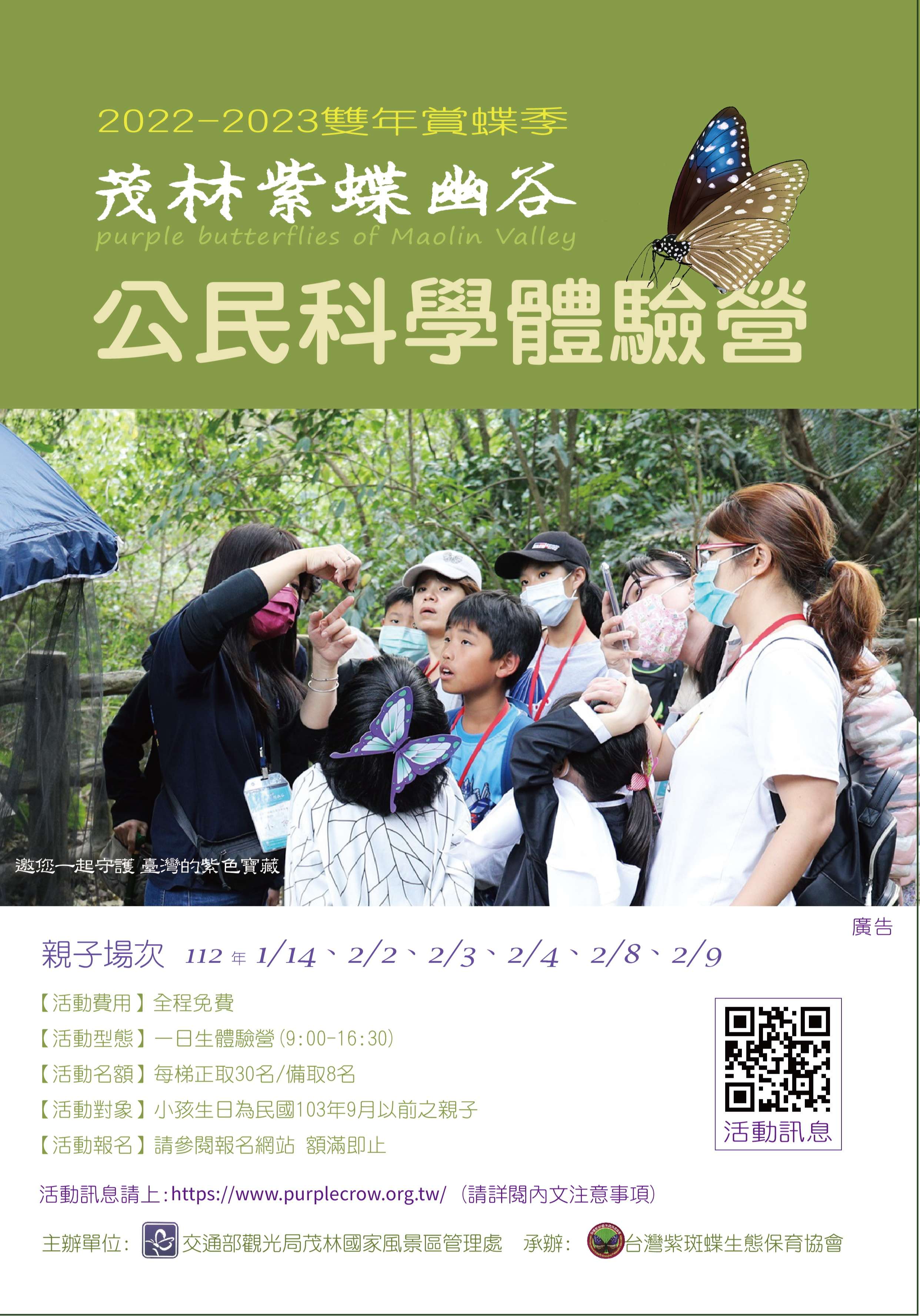 主旨:有關交通部觀光局茂林國家風景處「2023高雄茂林紫蝶幽谷雙年賞蝶紀公民科學體驗營─賞蝶親子體驗營」活動資訊,請查照。