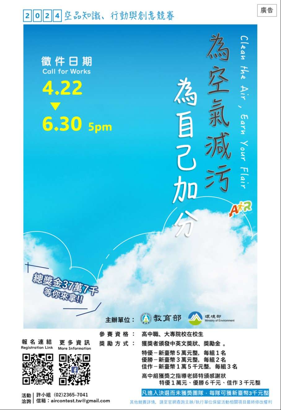 四、本次競賽官網如下:請點,歡迎學校師生至活動官網了解參賽資訊,隨函檢附「2024空品知識、行動與創意競賽」高中組簡章、說明會場次表及宣傳海報各1份,如有問題,請洽教育部承辦人陳先生,電話:02-77129035。
