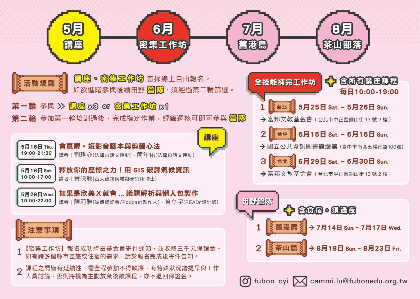 二、本次系列的講座、工作坊和田野營隊,包含了氣候溝通的理論及實作。學員將(1)學習從GIS圖資套疊的技術認識台灣的山川地貌、雨量、氣溫等如何與之交互影響;(2)學習拍攝剪輯一支短影片,以傳遞訊息給更多人;(3)學習問出一個有深刻意義、有溫度並與氣候變遷有關的提問,藉由深刻的田野調查,發掘土地與人的連結,讓台灣的大自然去回應你的問題;將這些學習製作成可以再次傳播出去的可視化圖片、短影片,讓更多人一起關心台灣這塊土地。