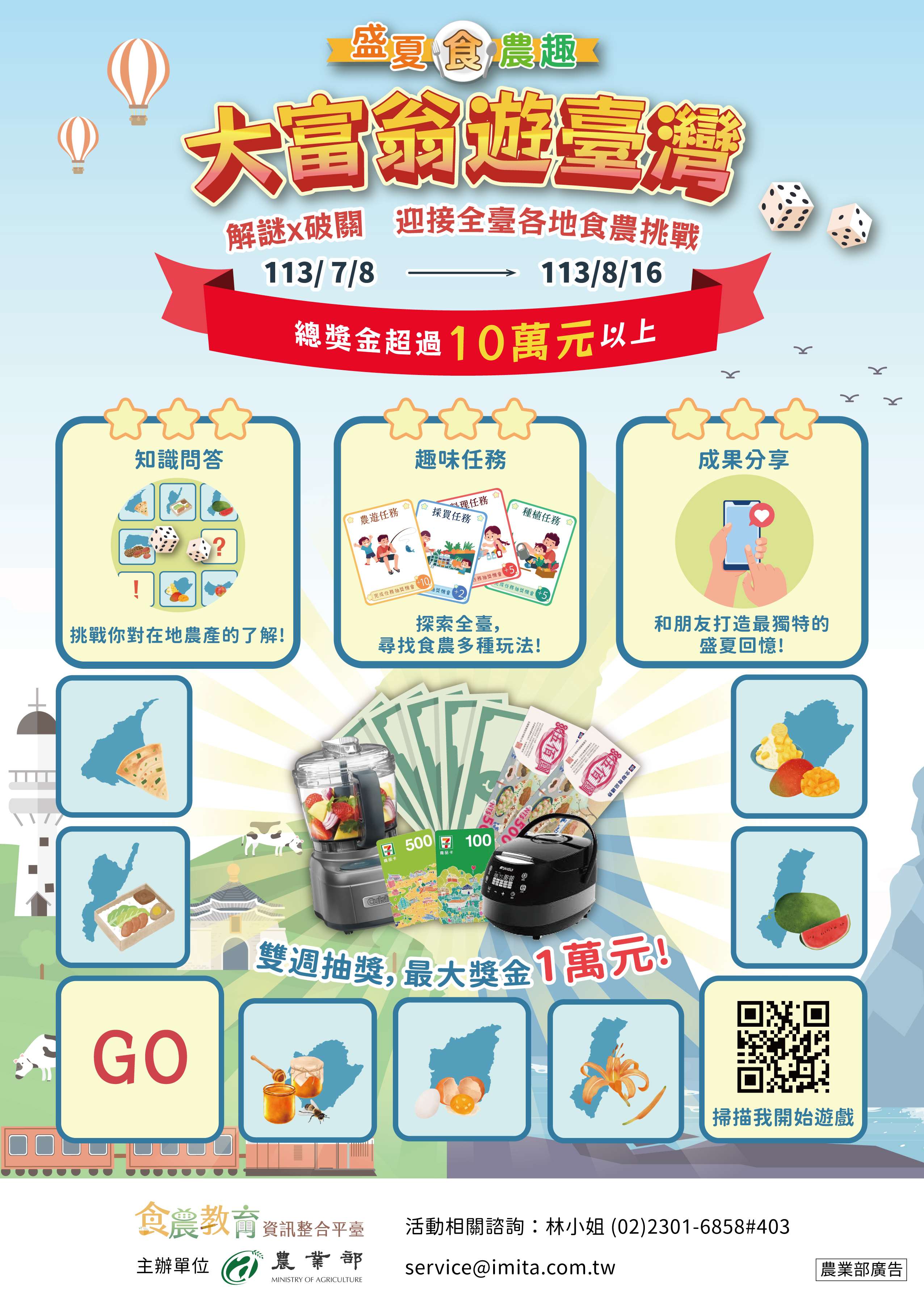 三、為促使大眾更加瞭解食農教育,農業部訂於113年7月8日至8月16日舉辦「盛夏食農趣:大富翁遊臺灣」食農教育推廣活動(網址:https://fae.moa.gov.tw/2024event/),提供食農教育相關知識問答、任務體驗與成果分享等遊戲,參與活動即可抽獎,總獎金超過10萬元,有興趣者歡迎踴躍參與。