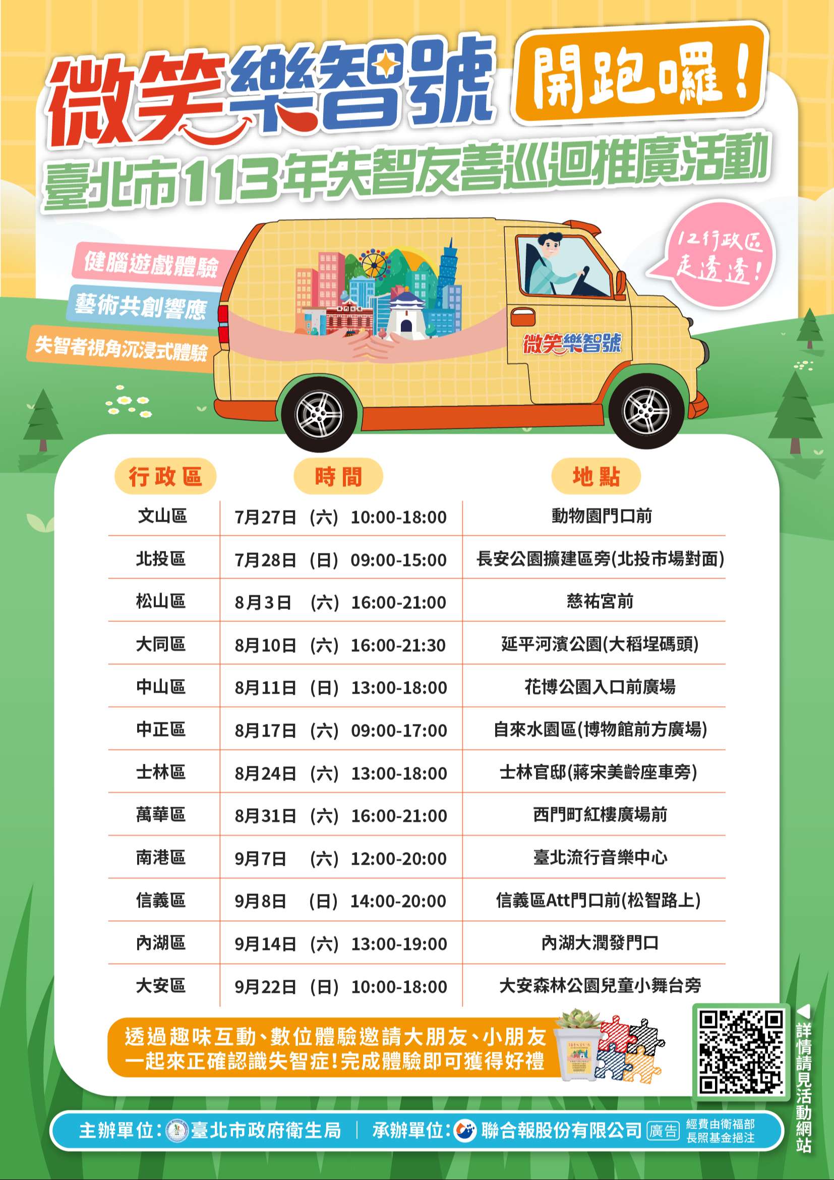 衛生局為增加民眾對失智症的認識,訂於113年7月27日至9月22日辦理12場「微笑樂智號」認識失智症胖卡巡迴推廣活動。結合「微笑樂智號」胖卡,規劃「健腦活動」、「沉浸式體驗展」、「藝術共創響應」等多元內容,巡迴本市十二行政區,藉由趣味互動吸引民眾參與,並認識及預防延緩失智症,成為友善社區的一份子,請市民踴躍報名參加。