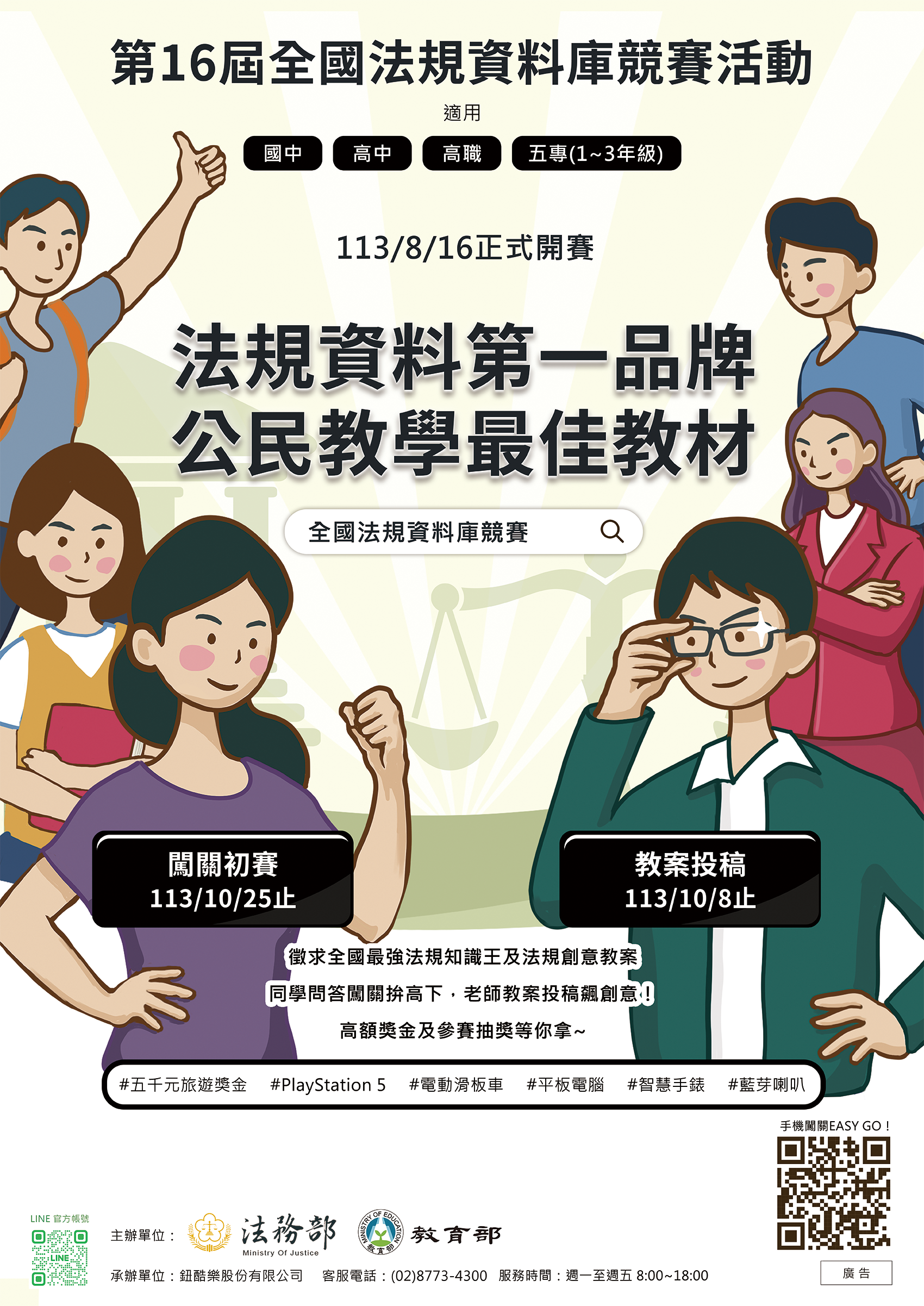 二、全國法規資料庫競賽活動,係法務部與教育部自97年起共同舉辦的競賽活動,目的為宣導全國國中、高中職(含五年制專科學校一、二、三年級)學生善用「全國法規資料庫」,建立知法守法的觀念,以及期許全國國中及高中職(含五年制專科學校)教師發揮創意將「全國法規資料庫」資源融入教學的競賽活動,本屆2式競賽活動內容如下: