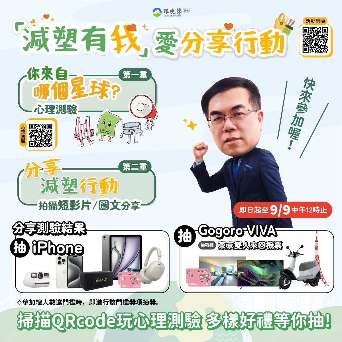 二、環境部為鼓勵社會大眾及莘莘學子一起跟上全球減少塑膠的風潮,特辦理「減塑有我」愛分享行動,可透過臉書(Facebook)、Instagram(IG)等社群媒體,拍攝個人生活中減塑短影片、減塑生活照片,並可透過參加「你來自哪個星球?」心理測驗遊戲,瞭解並發覺屬於自己獨特的環保行動,歡迎民眾邀請親朋好友一起在生活中響應減塑行動,參加旨揭活動拿大獎。