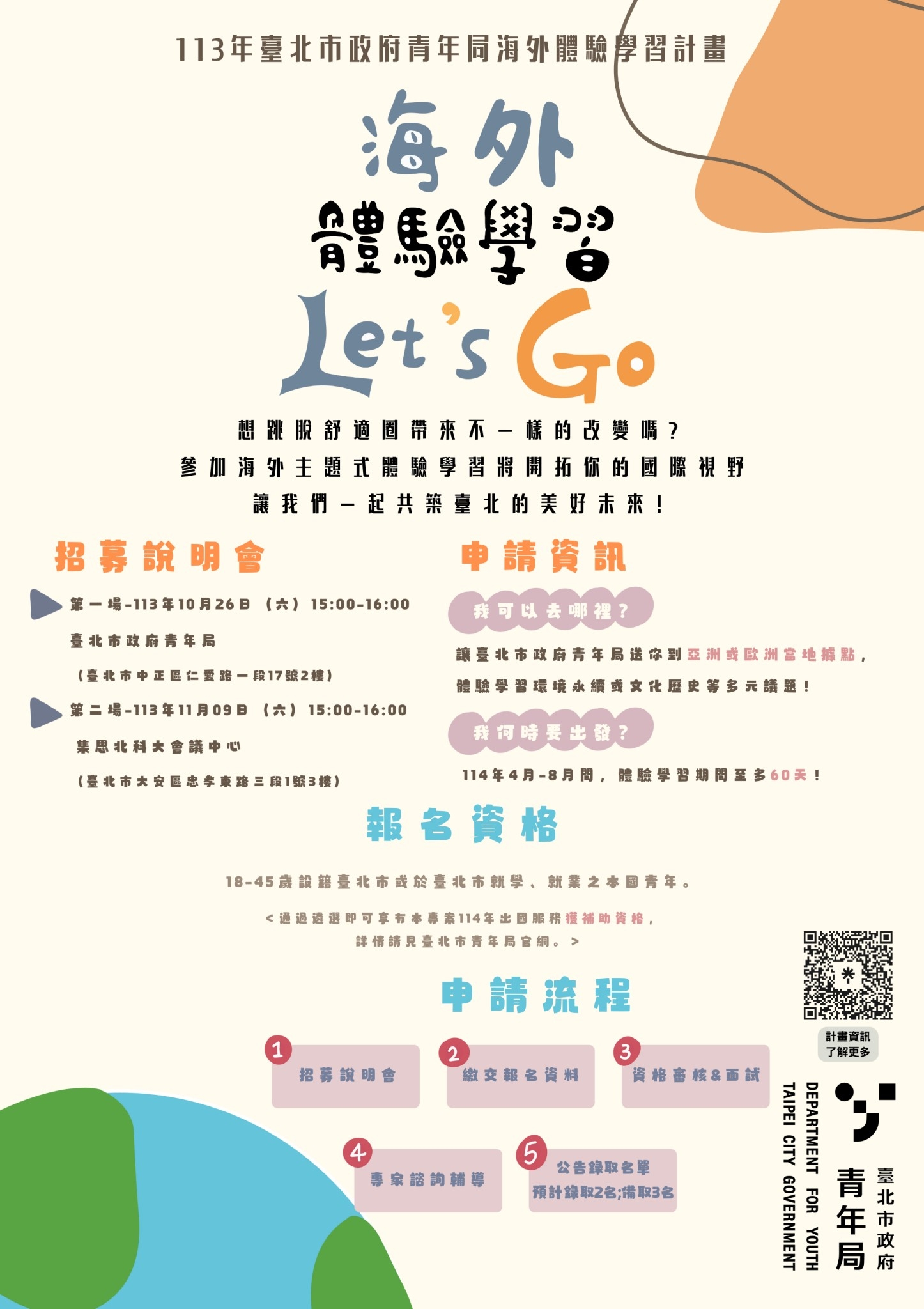 (一)參加資格:具有中華民國國籍者,且於本市設籍、求學 或就業,年滿15歲且未滿46歲,願意投入短期海外志工 服務之青年;另本計畫將保障二分之一名額予新住民或 其二代青年,符合資格者請提供戶籍謄本。