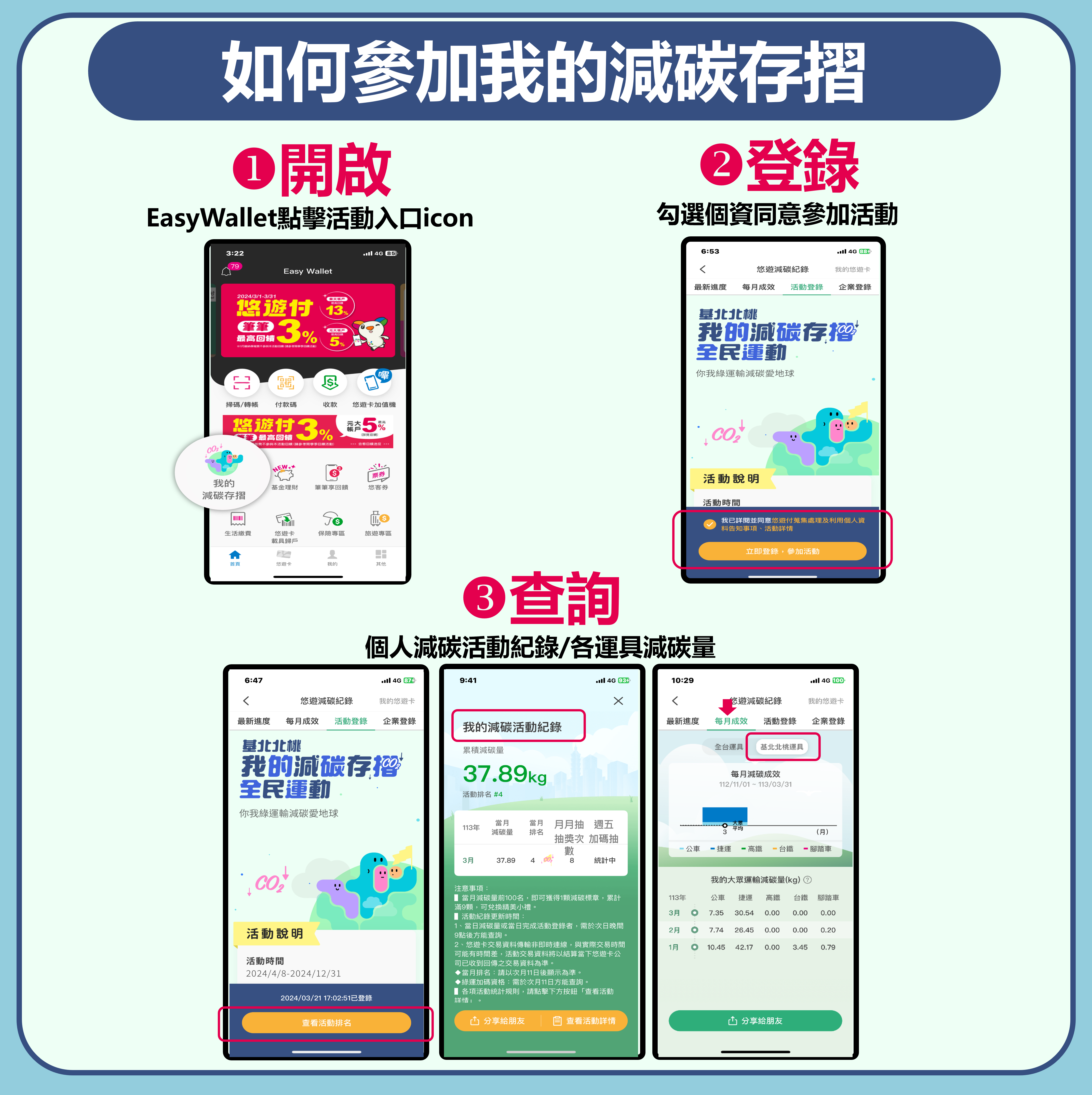一、為攜手市民多使用公共運輸,以朝淨零碳排目標前進,由政府、企業一起帶動全民綠運輸減碳,基北北桃四市交通單位、公共運輸業者及悠遊卡股份有限公司共同推動旨揭活動,於113年4月8日至113年12月31日止,只要加入「悠遊付Easy Wallet」APP會員,綁定與使用本人記名悠遊卡,搭乘基北北桃公共交通運具(公車、公路及國道客運、捷運、輕軌、臺鐵及YouBike)即可計算減碳量,每月獎項高達7,000份以上,搭乘公共運輸越多,就有越多中獎機會。