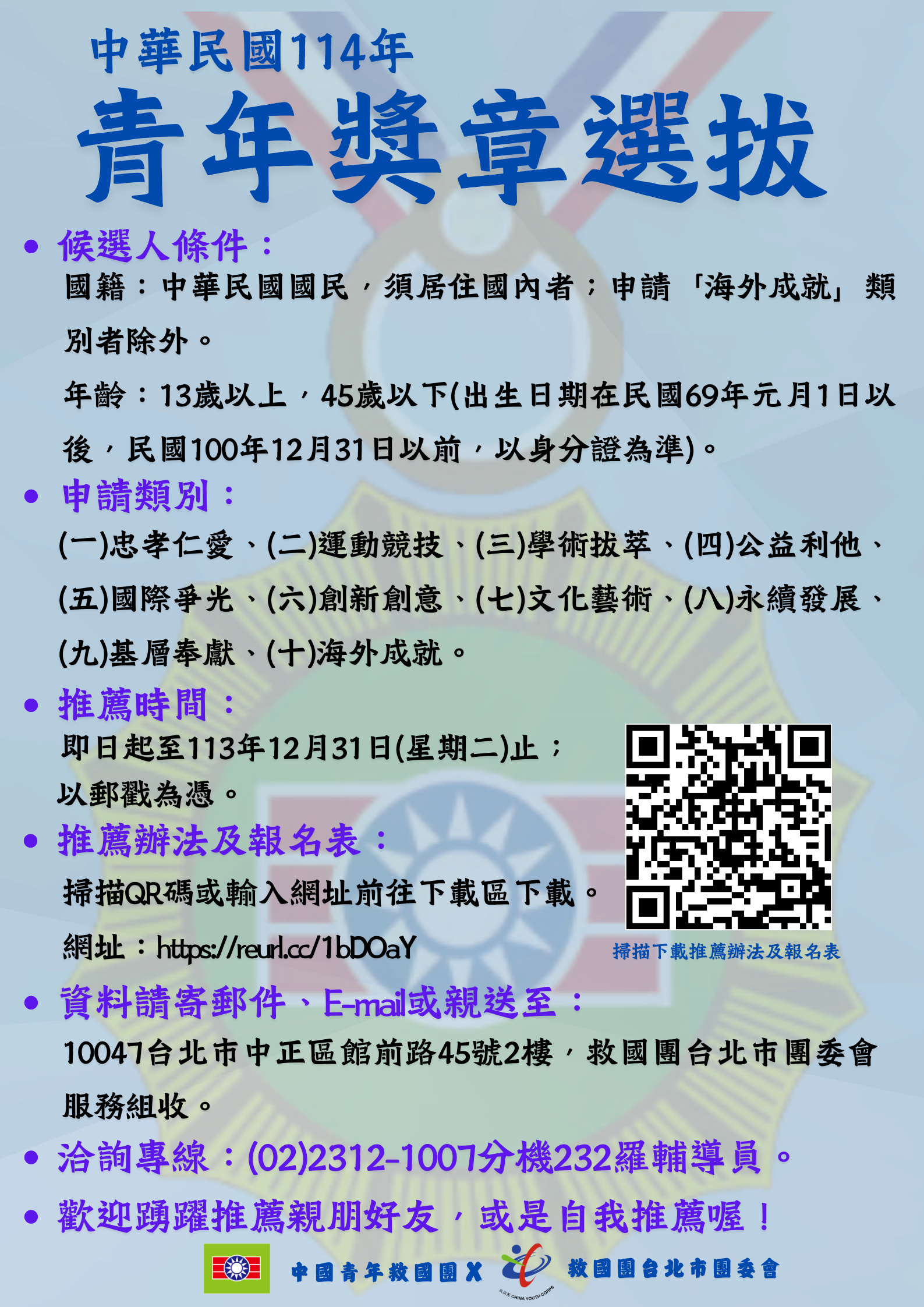 二、青年獎章實施辦法及候選人推薦表如附件,可於救國團臺北市團委會官網之下載專區下載。救國團臺北市團委會/下載專區下載。