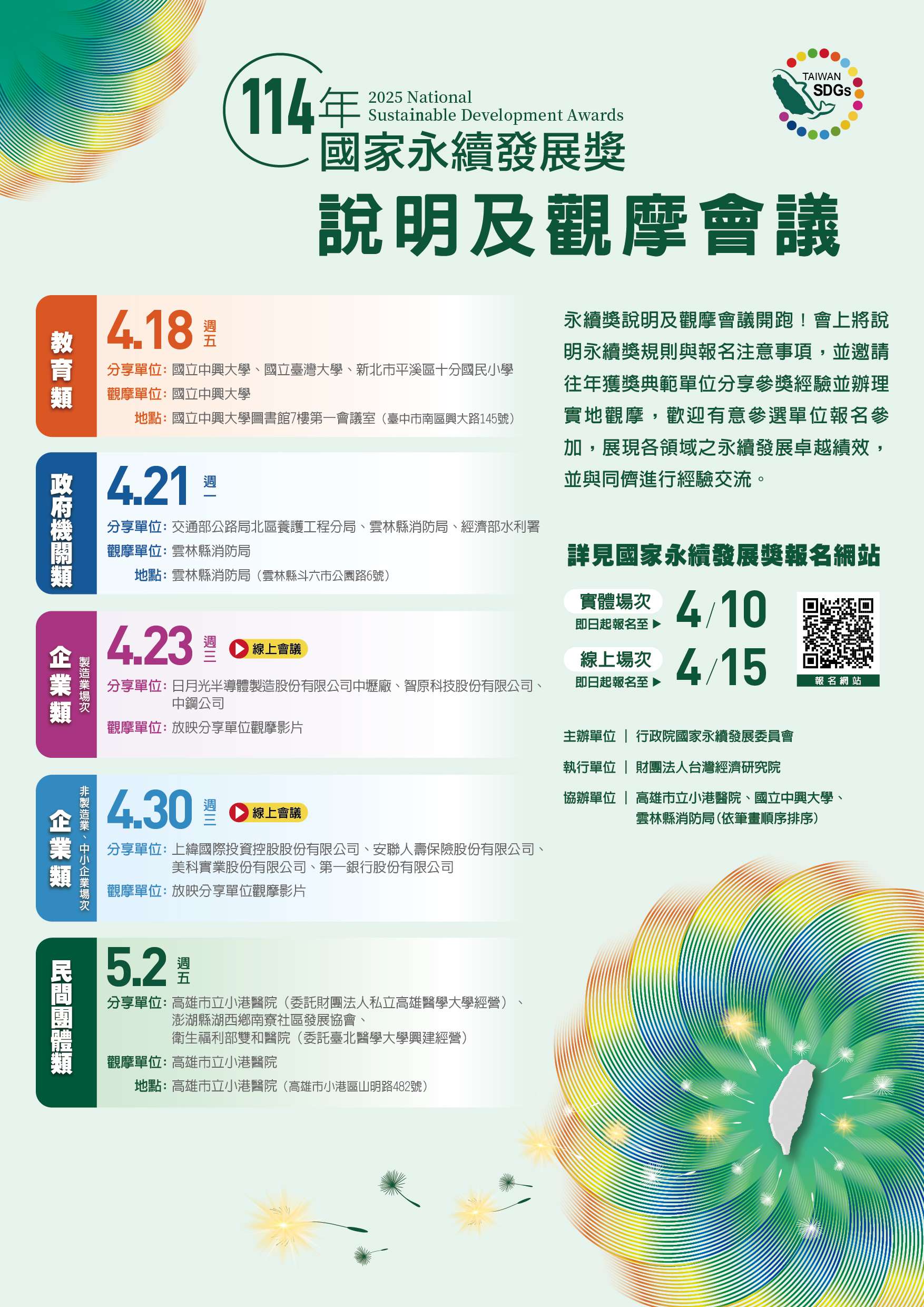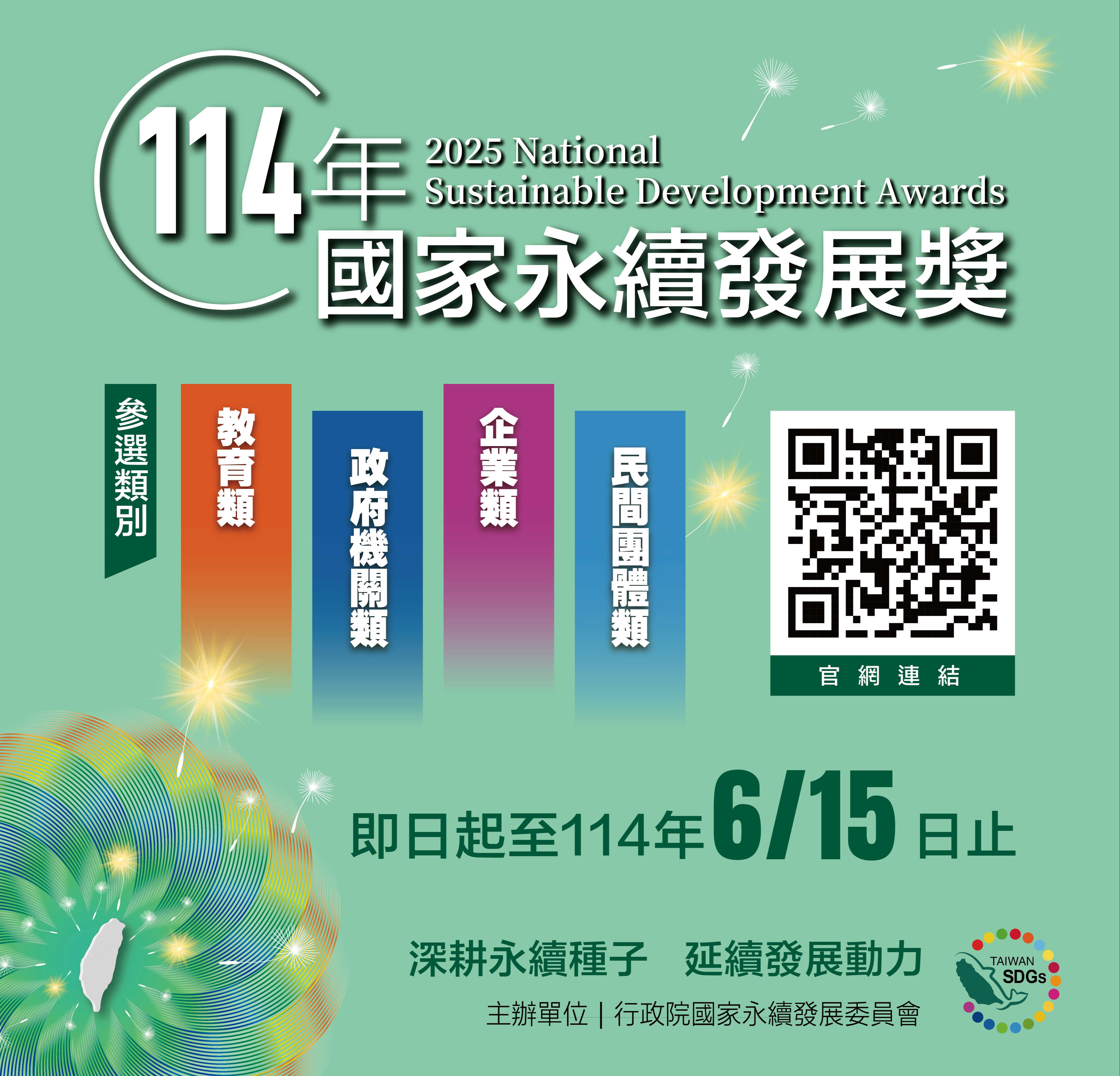 三、為增進各界對於國家永續發展獎之瞭解,並促進永續發展相關經驗互相交流與分享,行政院國家永續發展委員會另舉辦「114年國家永續發展獎說明及觀摩會議」,可免費線上報名,歡迎有意參加選拔者踴躍參加,教育類場次資訊