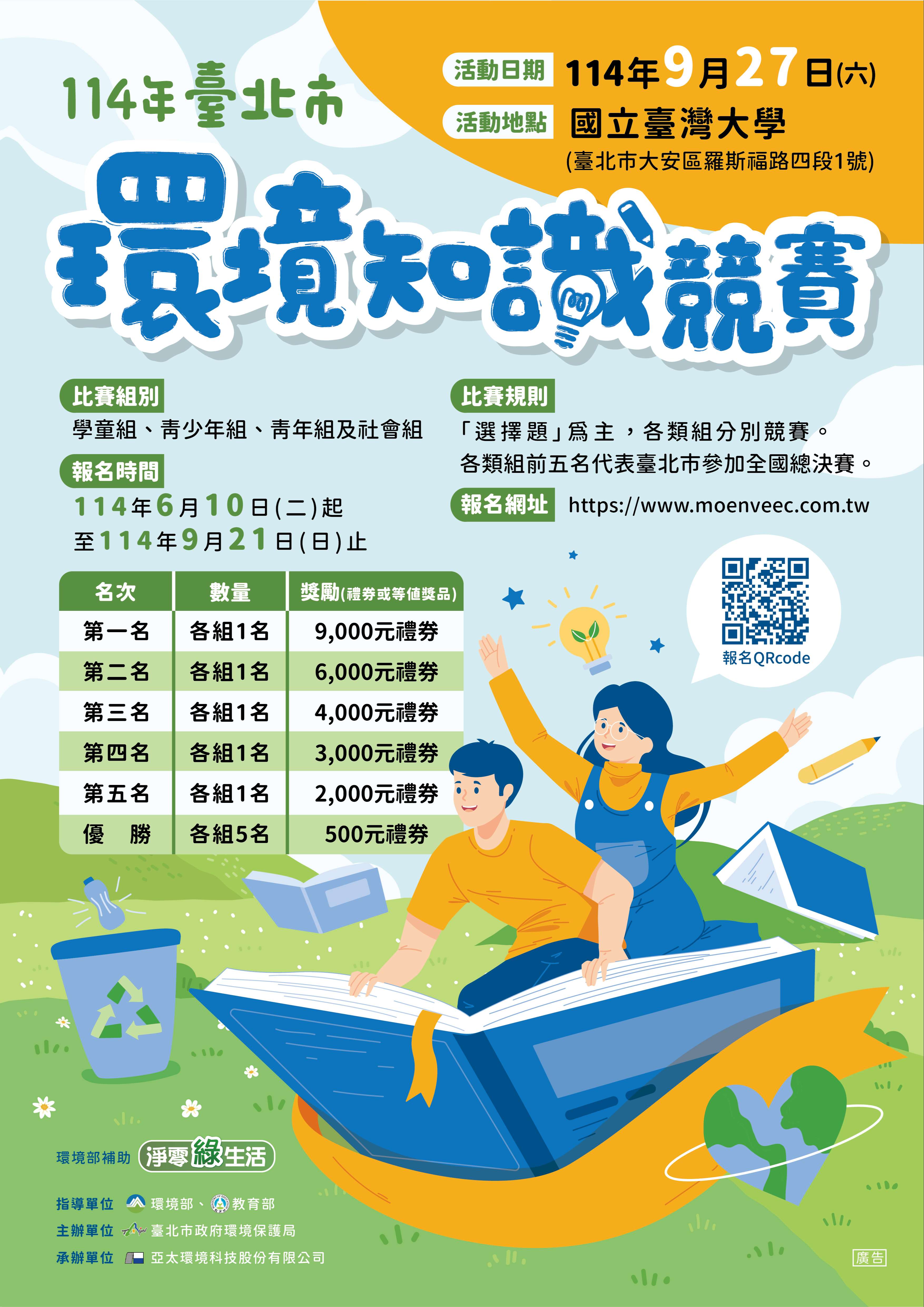 三、本市初賽各類組優勝前5名將代表本市參加環境部辦理之全國決賽,初賽各類組獎勵方法詳競賽須知。隨文檢送競賽須知1份及海報1份(如附件),敬請協助公告宣傳,有相關問題請洽本局彭國淵先生(電話:02-2720- 8889分機7232),或洽本局委辦單位亞太環境科技公司黃名倫先生(電話:02-2218-9099分機233)。