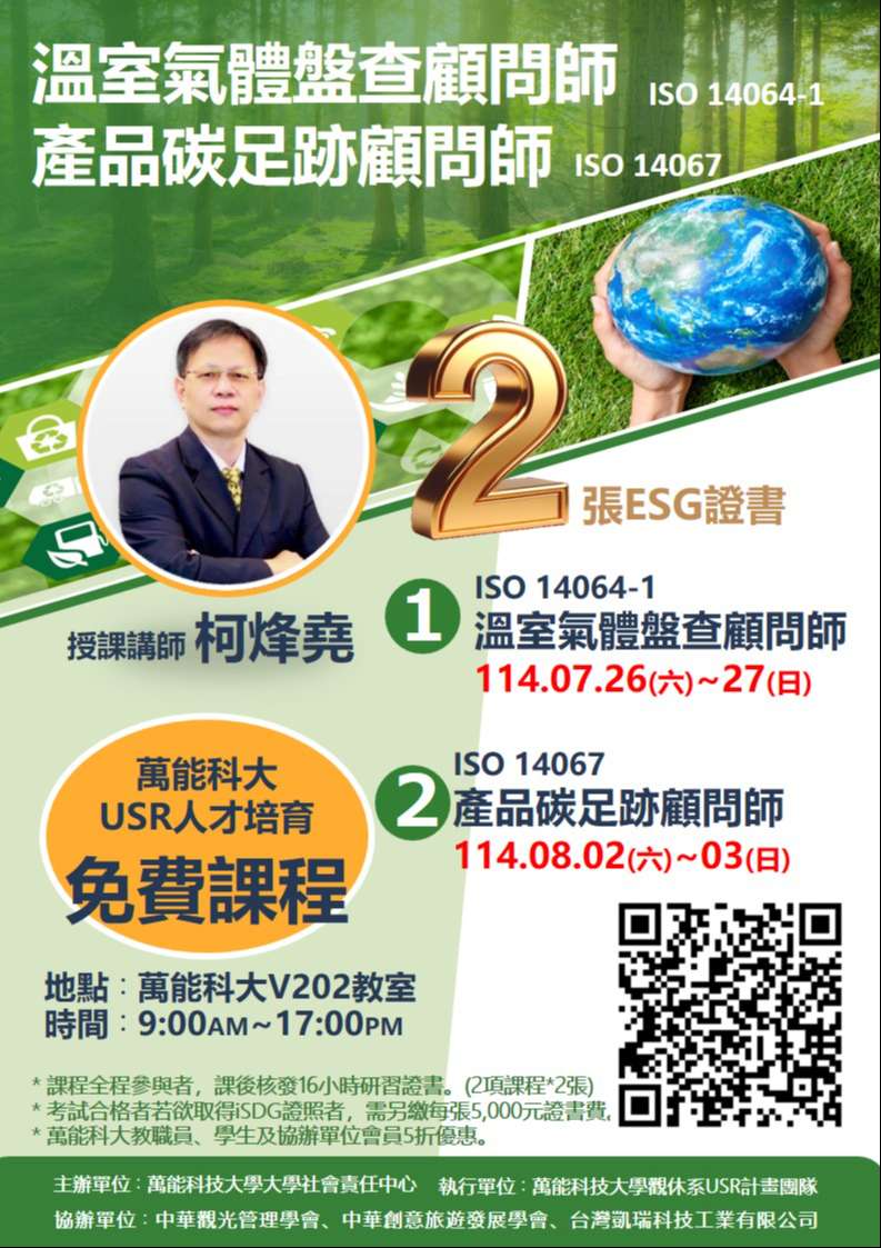(一)ISO 14064-1溫室氣體盤查顧問師:訂於114年7月26日(六)至27(日)辦理。