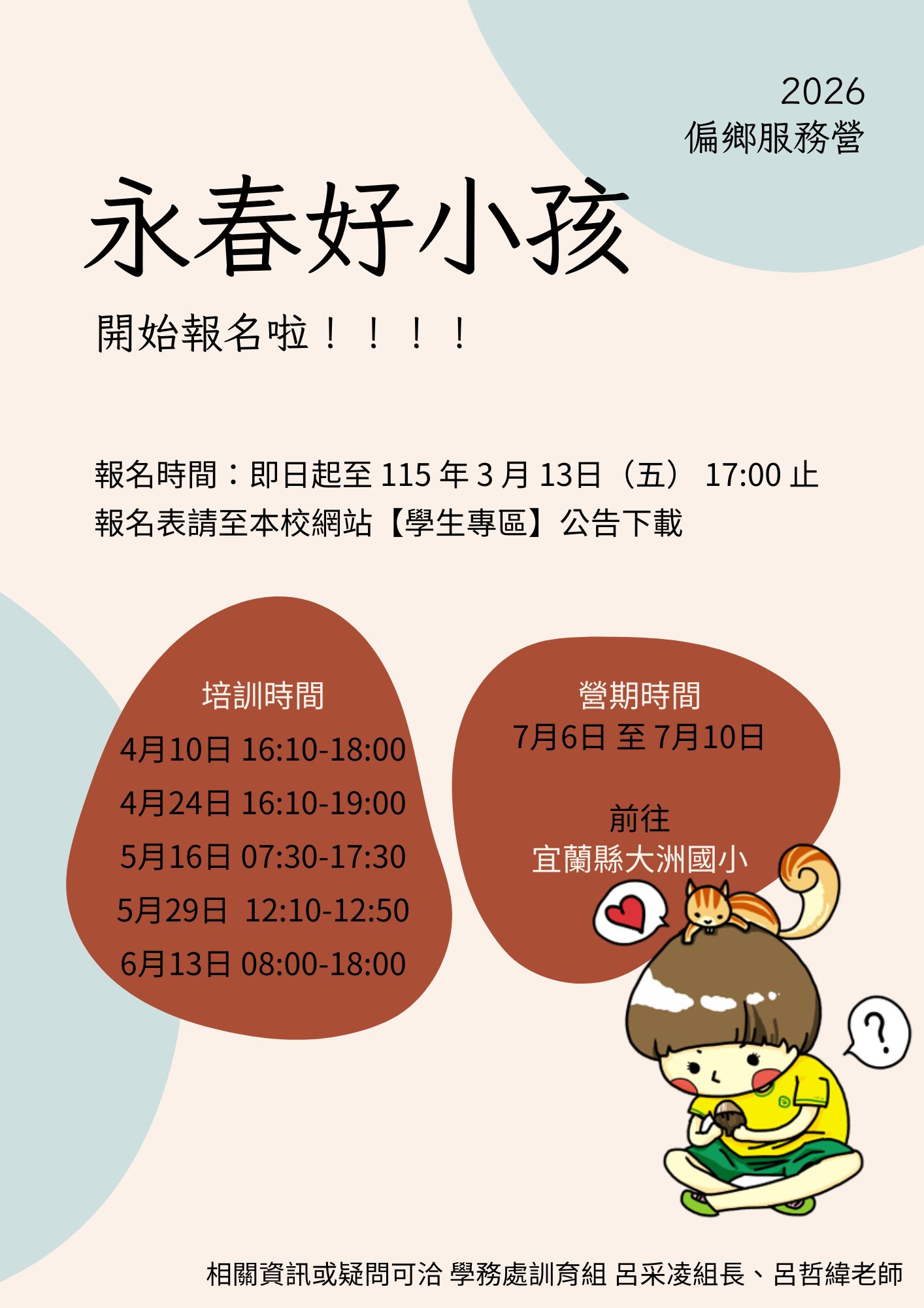 報名時間:即日起至3月13日(五)17:00止(報名表請自行於本公告附件下載,電腦繕打,完成後繳交紙本至學務處訓育組)
