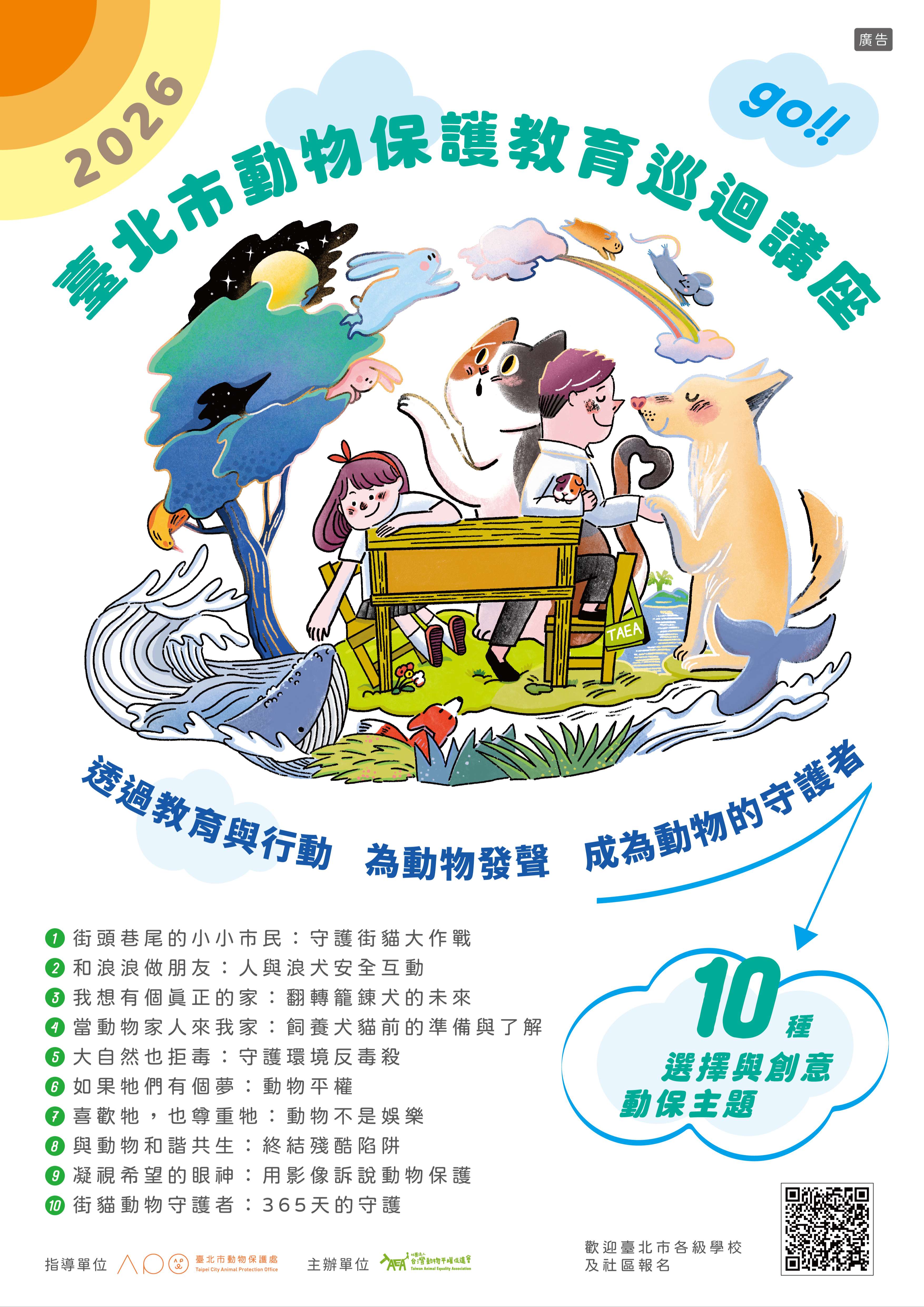 二、為推廣本市動物保護及生命教育工作,本處115年度補助旨揭團體辦理「2026年度動物保護教育巡迴講座計畫」,該計畫提供本市幼稚園至大學及社區大學免費參與(每場報名人數需為20人以上),講座時間可配合各單位安排,報名資訊及宣傳文宣詳如附件,惠請貴單位踴躍報名。