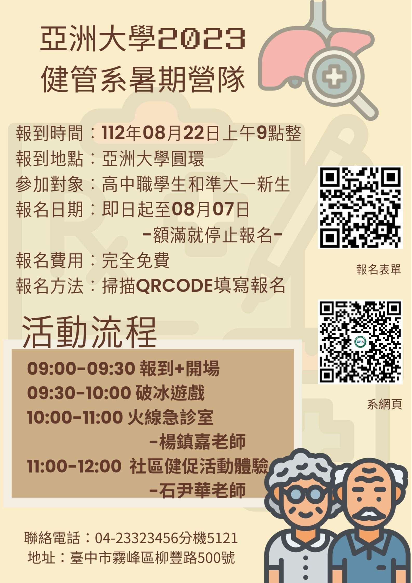 三、本夏令營主要對象為高一至高三生(含準大學生)。藉由 體驗健康產業相關活動,以鼓勵青年學子未來投入健康產 業為目標,使學員認識本校健康產業管理學系之學系特色 與畢業後未來可就業方向。