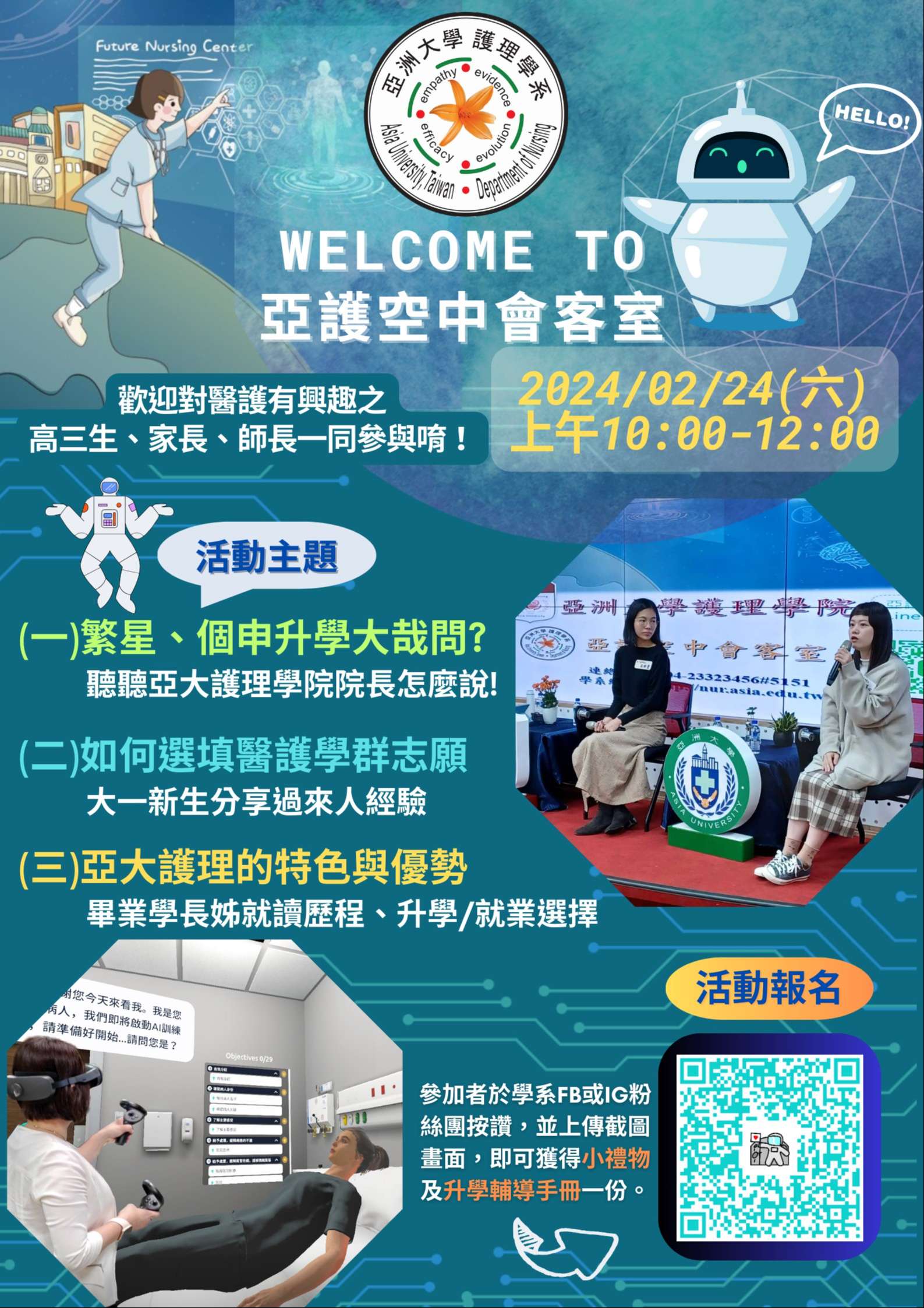 一、為提升高中生對醫護學群之認識,本校護理學系特別規劃 「亞護空中會客室」直播互動節目,希望透過此活動,使 高中生能更清楚了解白衣天使的專業特色與優勢。