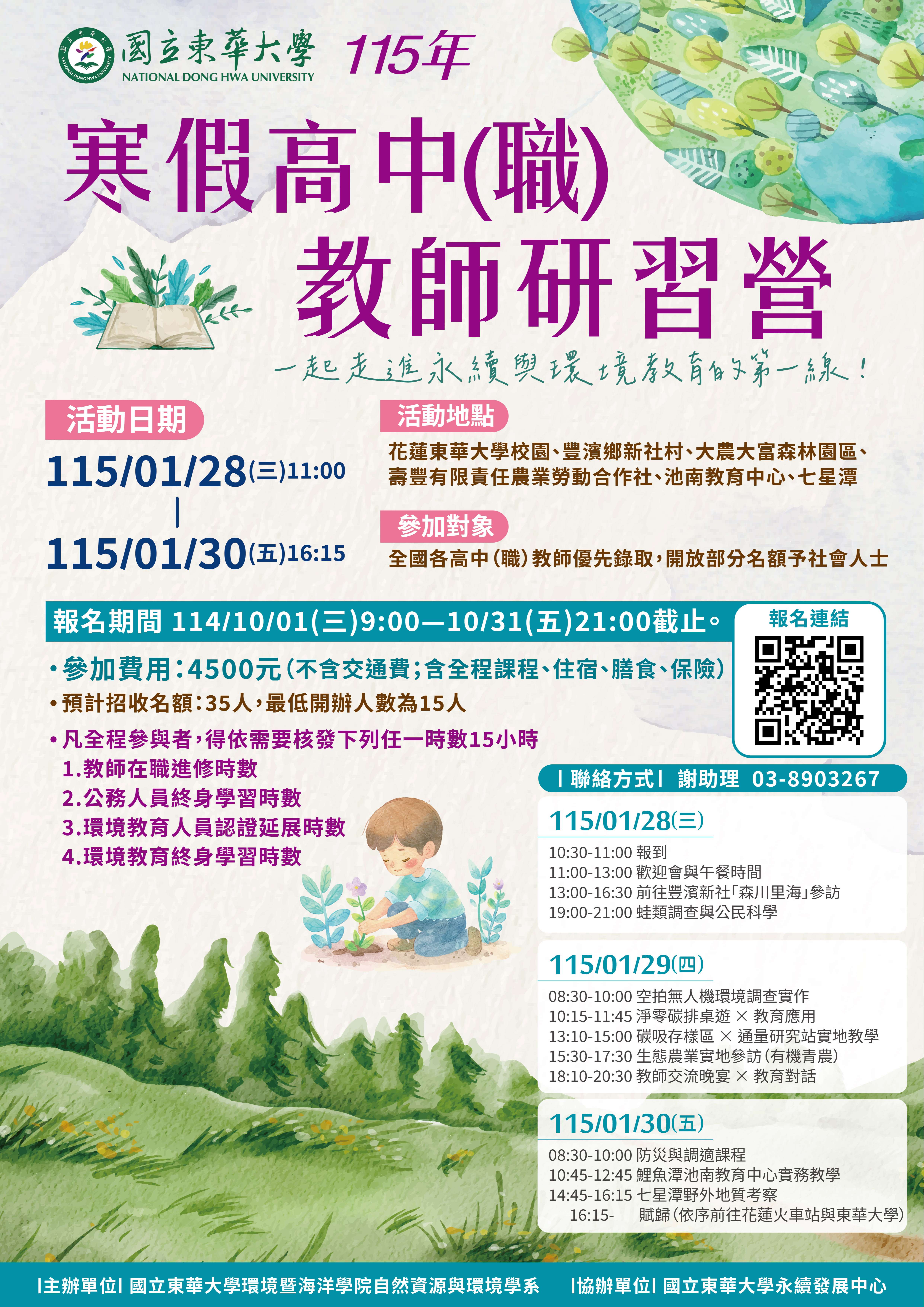 一、本校自然資源與環境學系擬於明年(115年)舉辦【115年寒 假高中職教師研習營活動】,以各高中(職)教師為對 象,透過研習活動提供大學端與高中端最新資訊交流平 台,聚焦於永續發展、自然環境與社會生態等議題。這有 助於教師掌握大學教育趨勢並增進對大學系所現況之瞭 解。同時我們期望通過與高中端的對話更加了解高中的需 求,從而協助教師引導學生做好進入大學前的規劃與準 備,特別是在環境和永續發展領域。
