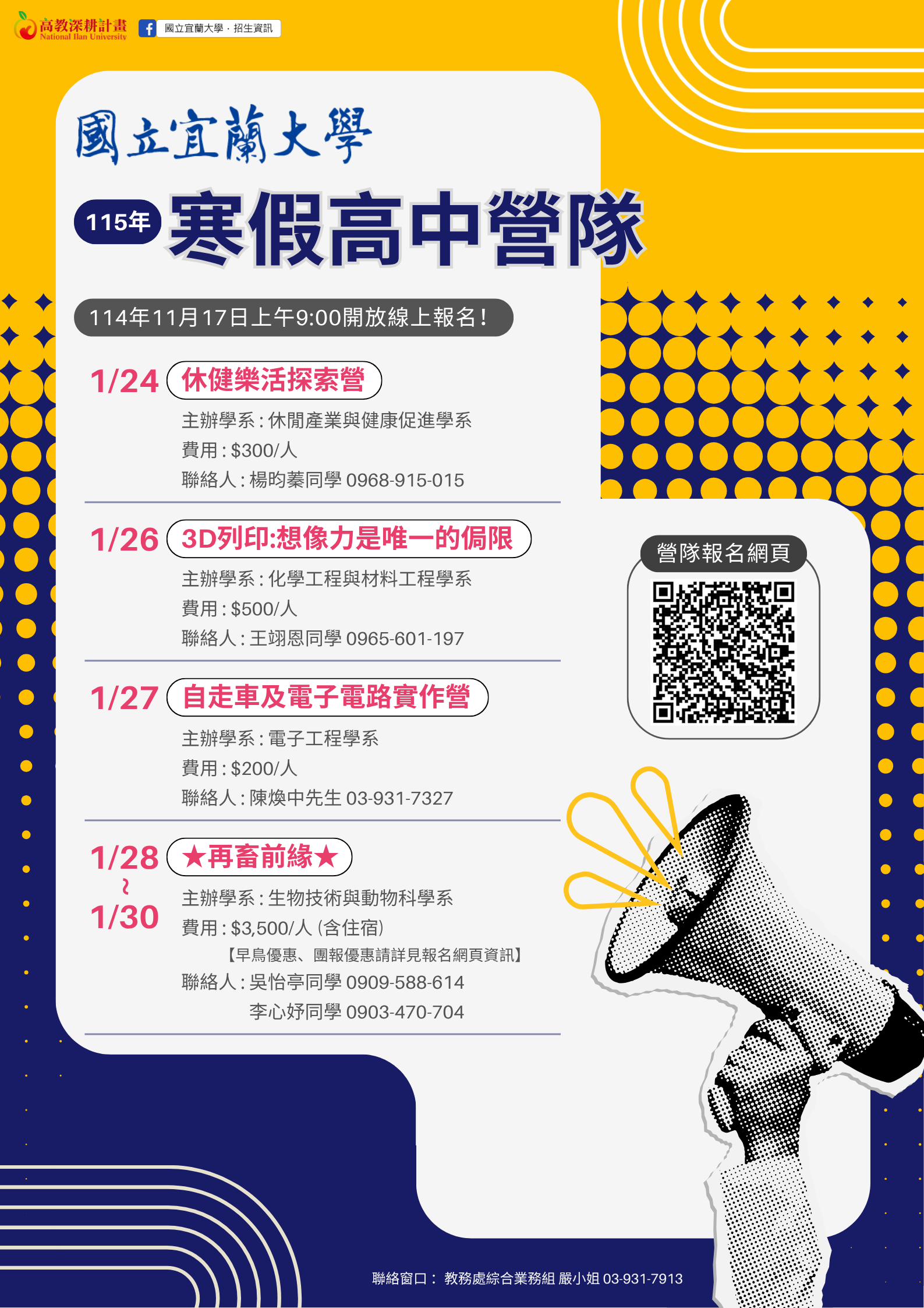 一、檢附活動海報乙份,完整訊息請至活動網站(網址: 請點此),或由國立宜蘭大學首頁(網址:請點此 )/招生資訊/在宜大夢想起飛/高 中營隊查詢。