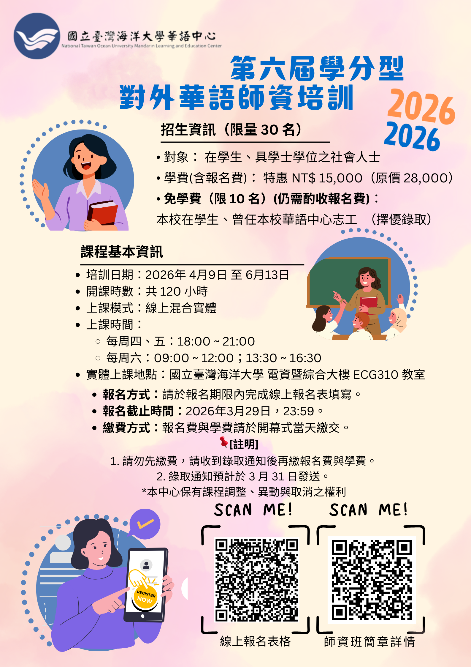 二、課程相關資訊如下: (一)培訓日期:115年4月9日至6月13日。 (二)上課模式: 採線上混合實體教學 。 (三)實體上課地點: 本校電資暨綜合大樓ECG310教室 。 (四)報名對象: 在學生(大學含以上)及具學士學位且對華 語教學有興趣之社會人士 。 (五)收費方式: 1、一般優惠價:NT$15,000元。 2、免學費名額:本校在籍學生或曾任本校華語中心志工者 ,限額10名(擇優錄取,仍需自付報名費1,000 元)。