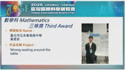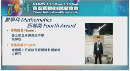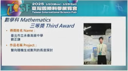 本校學生入選2025臺灣國際科學展覽會(TISF)共五件(數學科、醫學與健康科學科),並榮獲2025臺灣國際科學展覽會(TISF)數學科三等獎與四等獎🏆🏆🏆