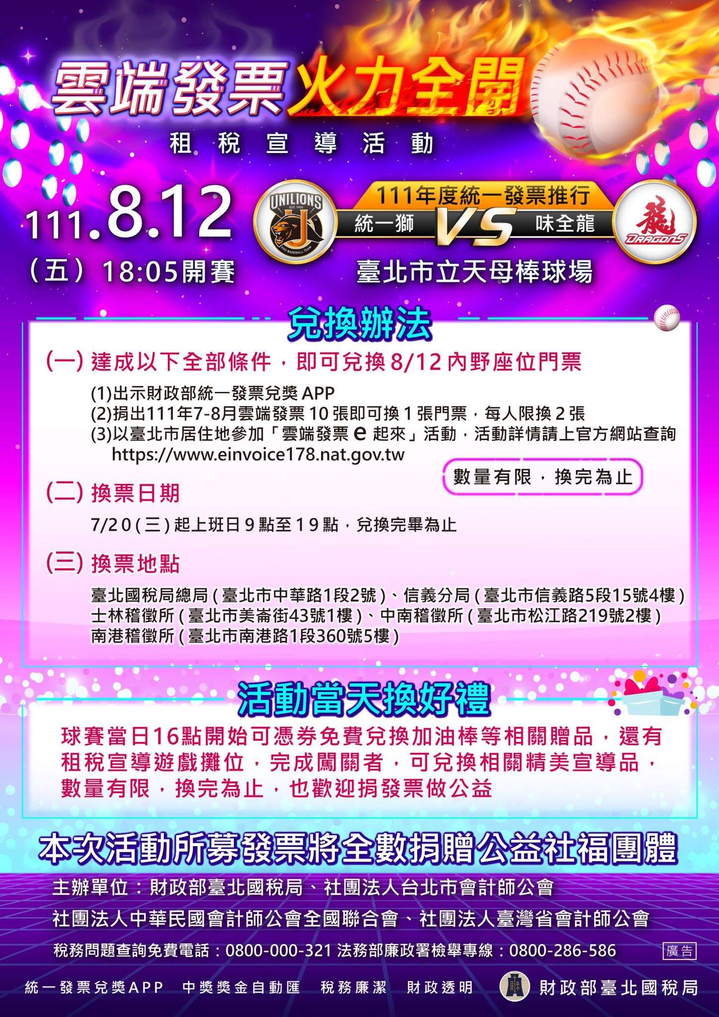 一、為加強宣導購物消費使用載具儲存於雲端發票、提升國人運動風氣及適時傳達與民眾攸關之財政部新便民服務措施,本局舉辦旨揭租稅宣導活動,111年7月20日開放民眾以雲端發票索取門票,且111年8月12日活動當天於天母棒球場設立宣導攤位,歡迎大家捐發票、做公益,詳細情形請見宣導海報,請鼓勵所屬機關同仁踴躍參加。