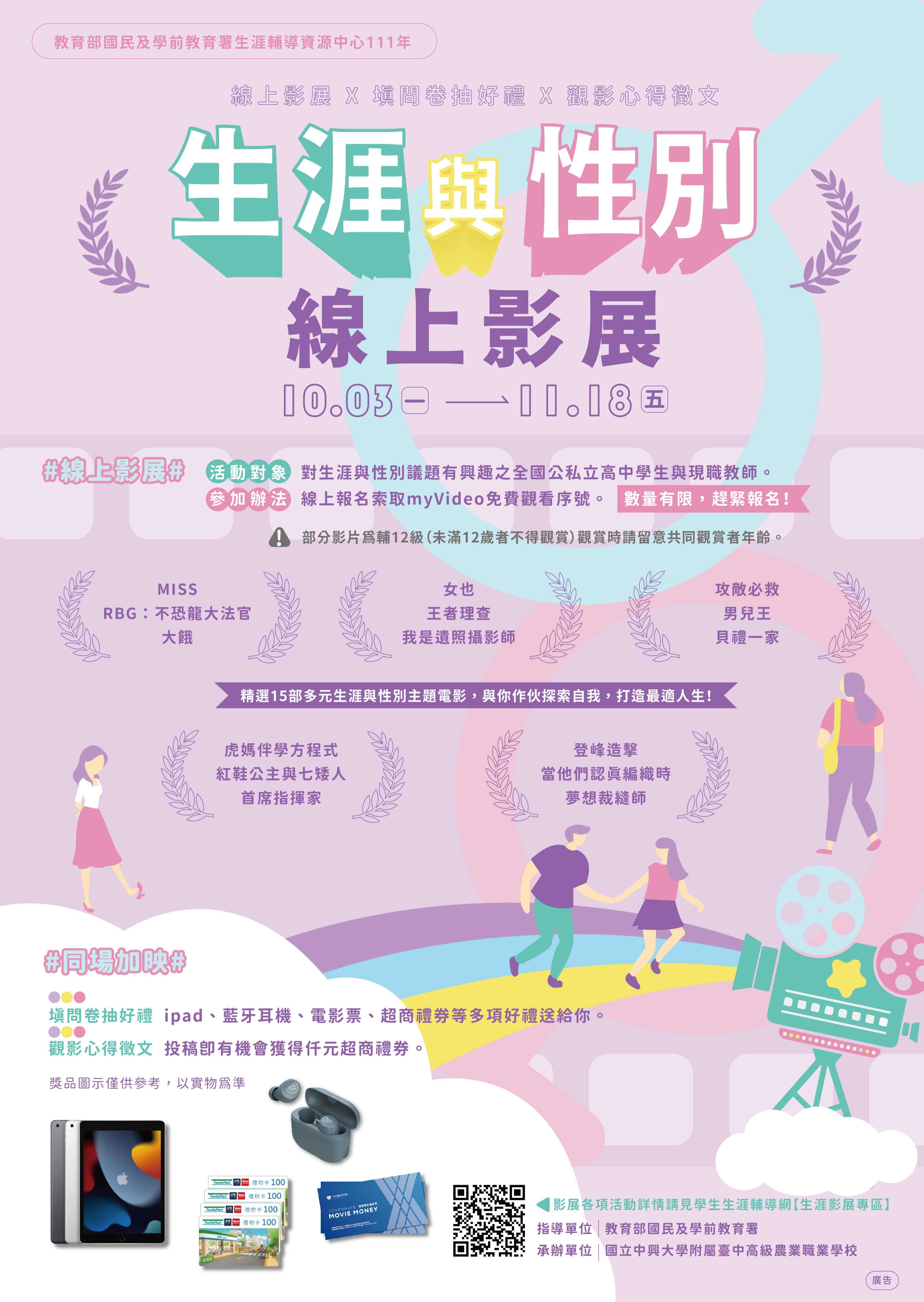 3、參加辦法:於問卷開放時間內,至本署學生生涯輔導網【生涯影展】專區填寫觀影意見回饋問卷,即可參加電腦隨機抽獎活動。