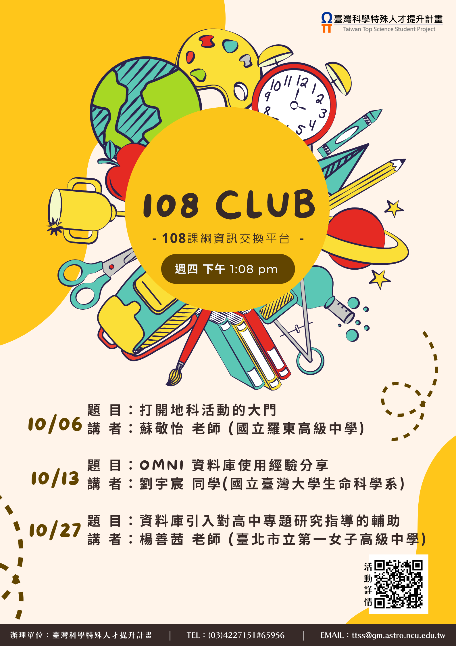 一、活動緣起:108課綱之實行已有三年,有些課程改革可見成效,但尚存有很多挑戰需要克服,尤其是如何設計可以由學生親手動作和操作(hands-on)的實驗或資料分析任務。108俱樂部是一個虛擬中心,旨在建立一個可供各位老師分享相關教學經驗和心得的平台,我們也將邀請大學端的教授介紹他/她們的實驗及研究計畫,特別是其中中學教師所感興趣的資訊。