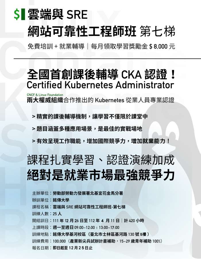 一、為因應SRE網站可靠性工程師廣大人才需求,並配合政府「亞洲矽谷」計畫,以協助青年就業,本校規劃辦理雲端與SRE網站可靠性工程師班。