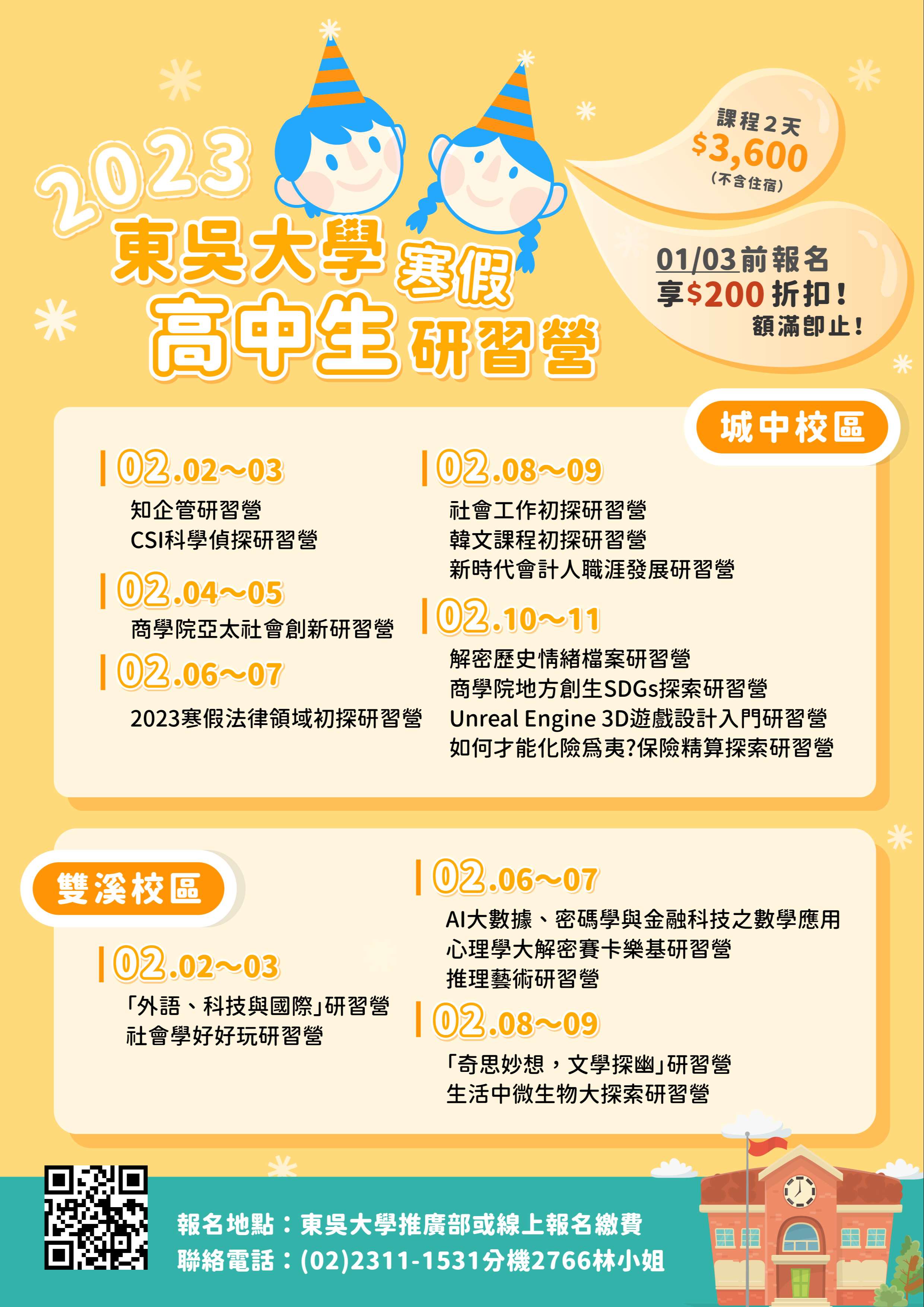 一、本次共計招生十八個研習營:知企管研習營、CSI科學偵探 研習營、「外語、科技與國際」研習營、社會學好好玩研習營、商學院亞太社會創新研習營、2023寒假法律領域初探研習營、AI大數據、密碼學與金融科技之數學應用、心理學大解密賽卡樂基研習營、推理藝術研習營、韓文課程初探研習營、新時代會計人職涯發展研習營、社會工作初探研習營、「奇思妙想,文學探幽」研習營、生活中微生物大探索研習營、商學院地方創生SDGs探索研習營、 Unreal Engine 3D遊戲設計入門研習營、 如何才能化險為夷?保險精算探索研習營、解密歷史情緒檔案研習營。