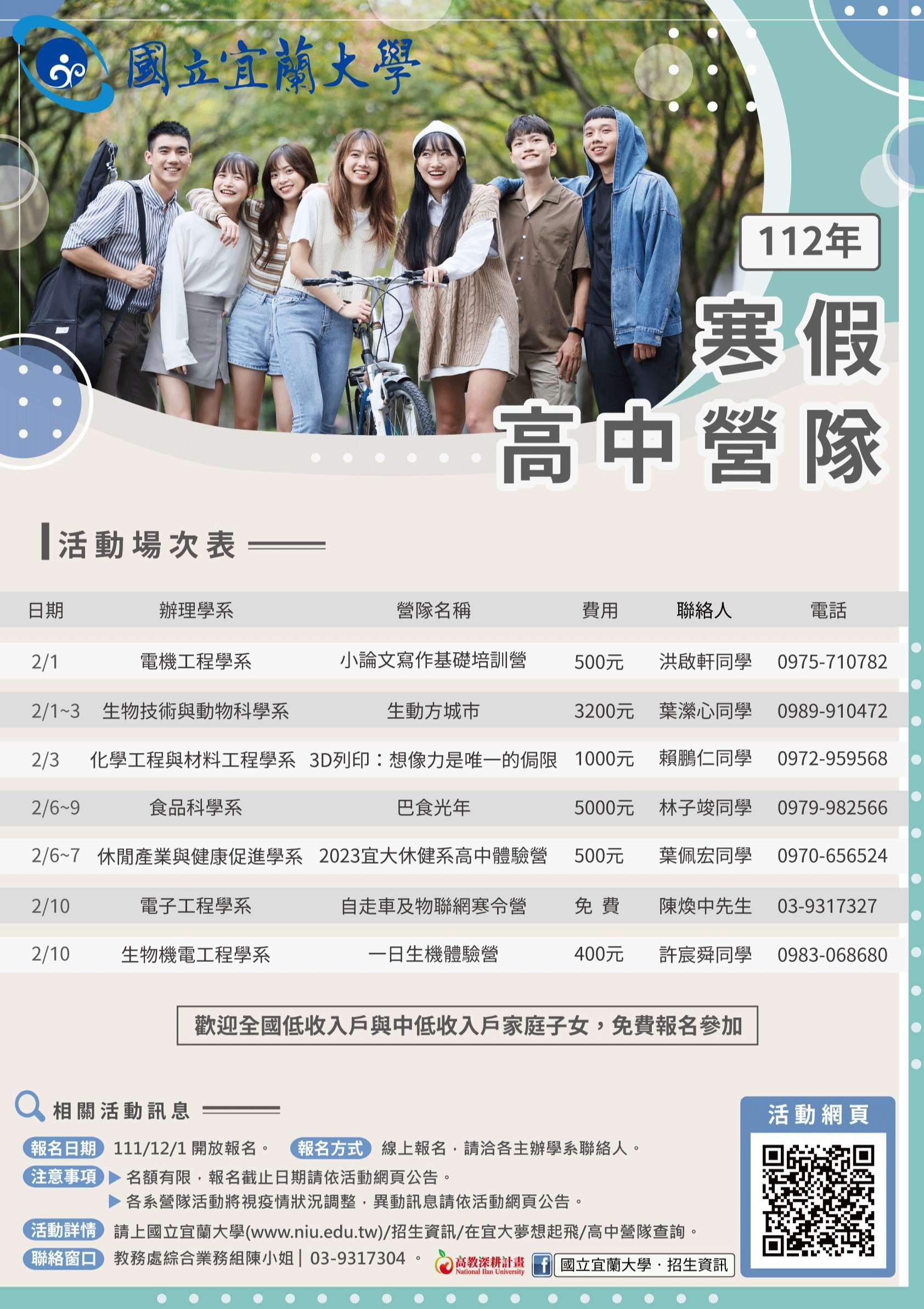 一、檢附活動海報乙份,完整訊息請至活動網站(網址請點此),或由國立宜蘭大學首頁(網址請點此)/招生資訊/在宜大夢想起飛/高中營隊查詢。