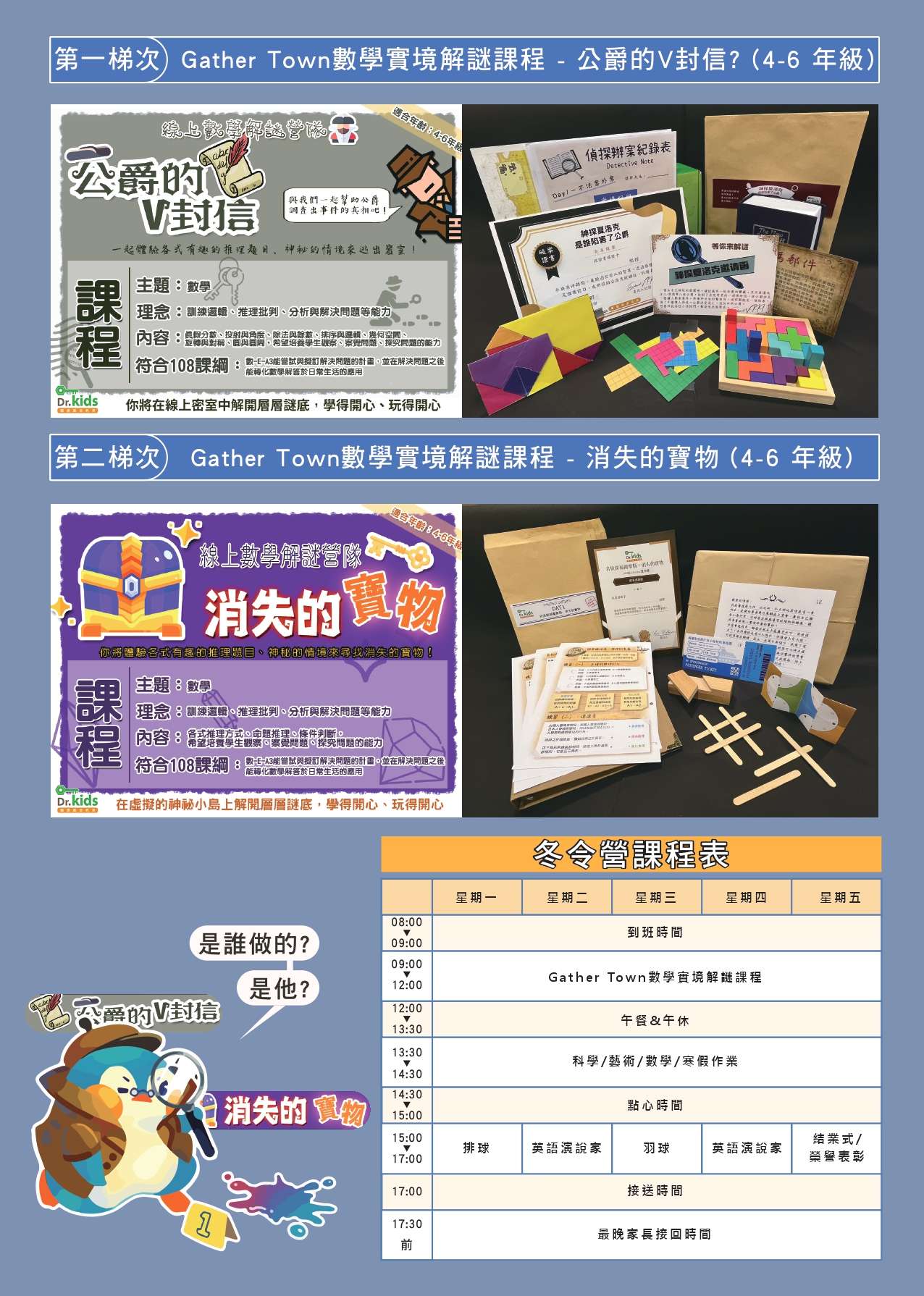 二、本次冬令營共分2個梯次,上午課程為數學實境解謎課程, 透過有趣的Gather Town搭配實體解謎教學,培養孩子邏輯思考的能力。下午課程為英語演說家、排球、羽球課程及寒假作業指導活動,聘請本校專業美語老師及體育師資聯手開課。家教式助教全程陪伴,帶領孩子沉浸英語學習環境中又能培養第二專長,讓頭腦和身體一起動起來。