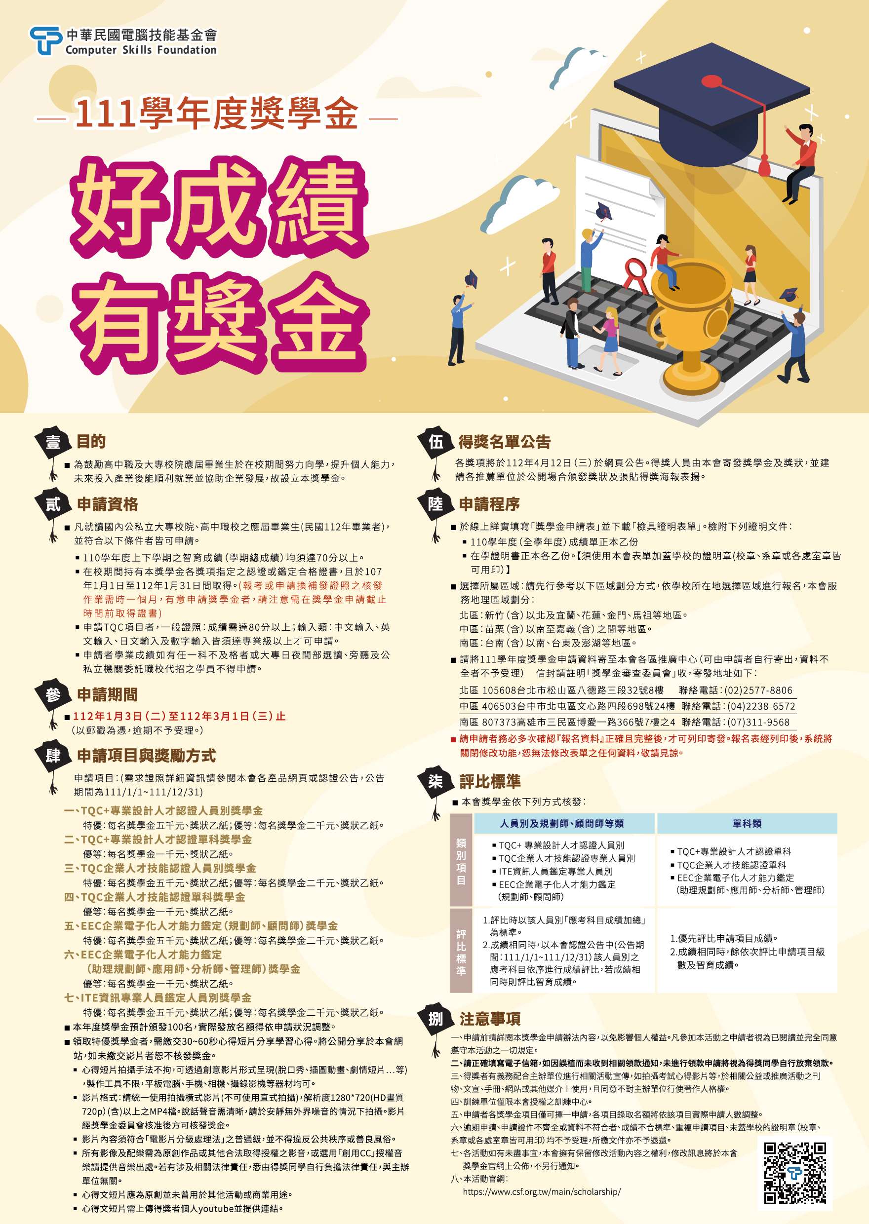 二、為獎勵具備專業資訊能力之優秀學生,得獎名單將於112/4/12(三)於本會網頁公告並委由就讀學校於公開場合頒發獎狀表揚。
