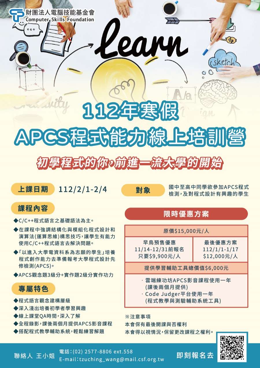 一、為幫助以進入大學電資科系為志願的學生培養程式設計能力,本會於線上平台舉辦「大學程式設計先修檢測(APCS)培訓營隊」由專業大學教授以C/C++語言講授觀念建構與程式實戰。