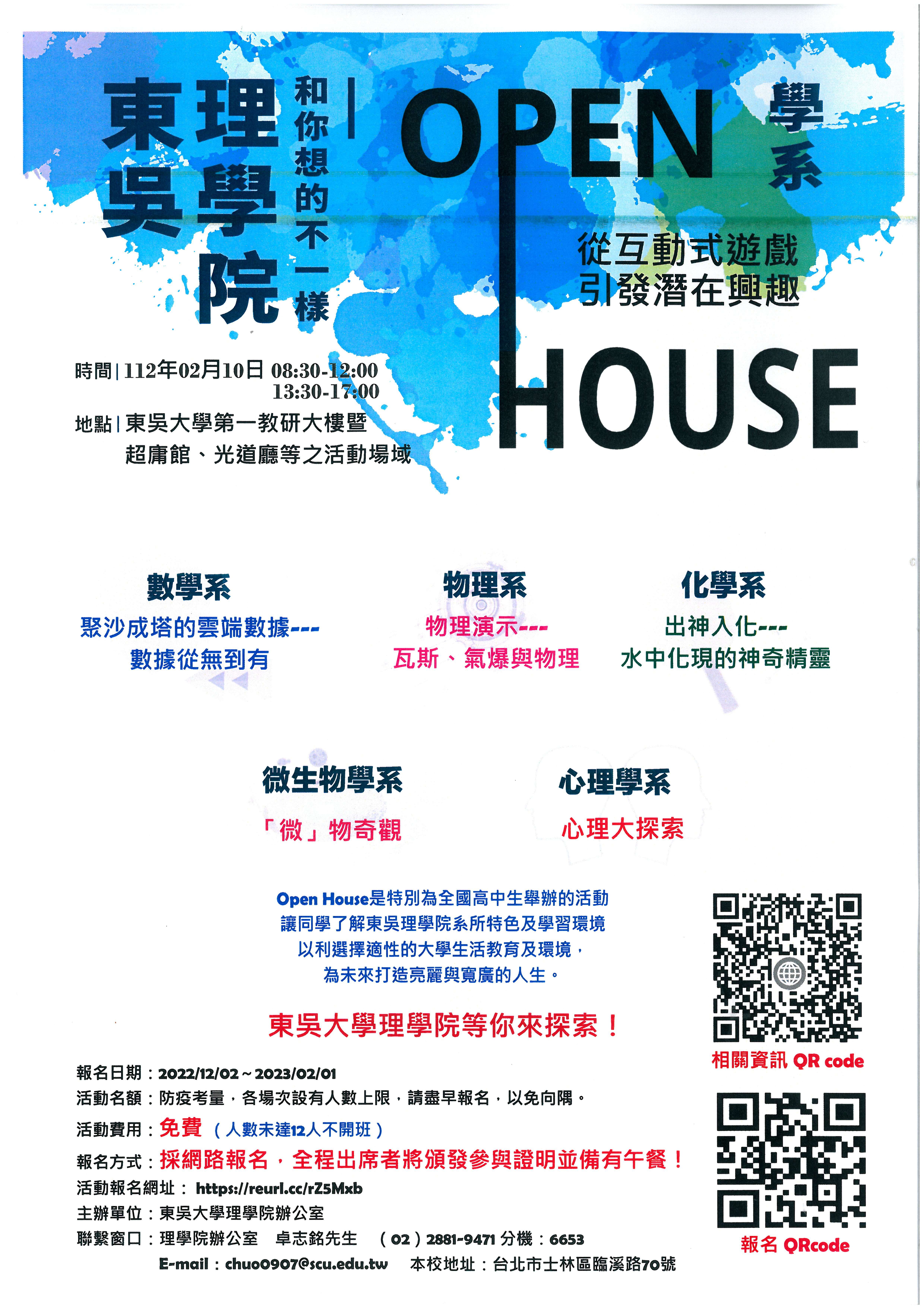 一、旨揭活動是特別為高中學生舉辦的活動,期藉此協助高中生瞭解本院各系特色與學習環境,以利其適性選擇校系,為未來打造亮麗人生。 二、活動時間:112年2月10日(星期五)08:30~17:00。 三、活動內容:學系介紹、實作體驗。 四、報名時間及方式:即日起至112年2月1日止,採網路報名,因防疫考量,本活動各場次皆設有參與人數上限,報名額滿即提早截止。 五、相關活動資訊請參閱網站:請點此;線上報名網址:請點此。 活動聯絡人:理學院卓志銘先生 分機:6653 E-mail:chuo0907@scu.edu.tw。