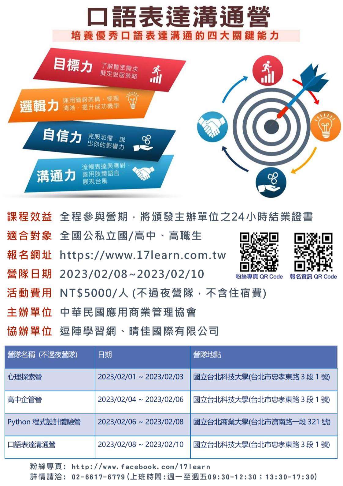 無論是升學口試或求職面談,口語表達已經是現代人不可或缺的能力。「口語表達溝通營」透過講解、示範、訓練和不斷的演練,克服公開發言的恐懼,人人都可以成為口語表達的高手!
