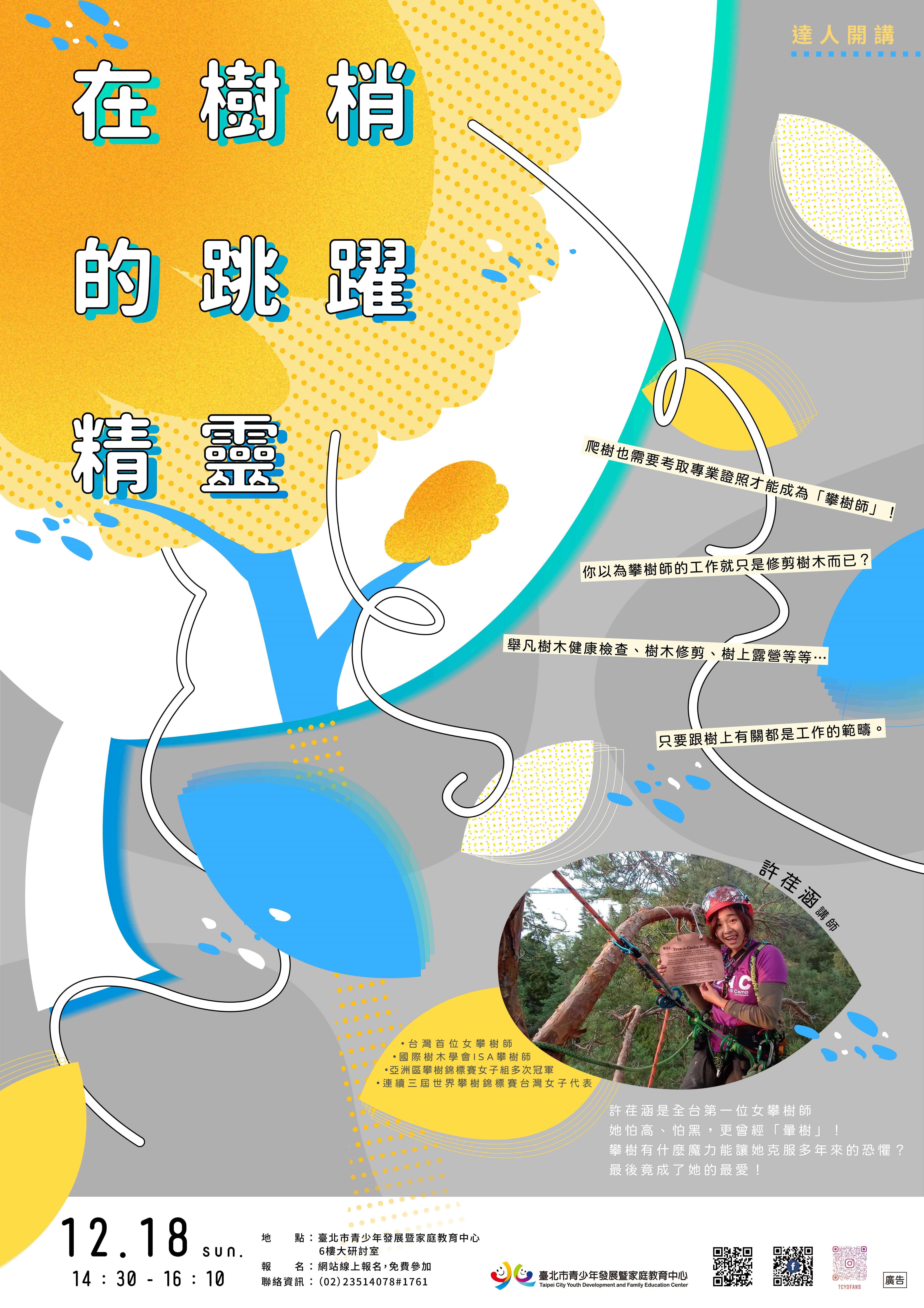 (二)60字:臺北市青少年發展暨家庭教育中心12月18日14:30舉辦達人開講:在樹梢的跳躍精靈。許荏涵與您分享她成為攀樹師的心路歷程;活動免費詳見青發家教中心官網。