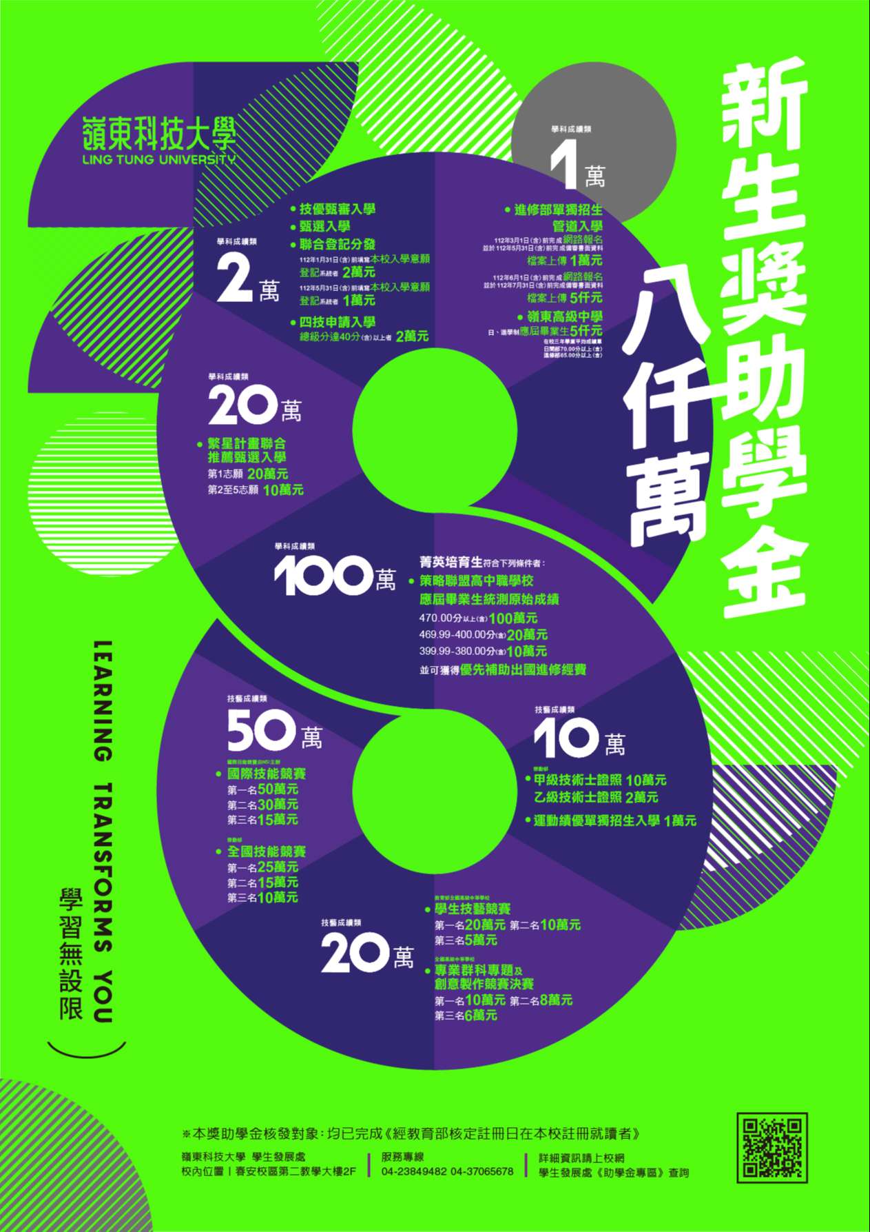 一、嶺東科技大學112學年度特提供新生入學成績優異助學金方案計新台幣捌仟萬元,敬請協助公告師生周知(如附件)。