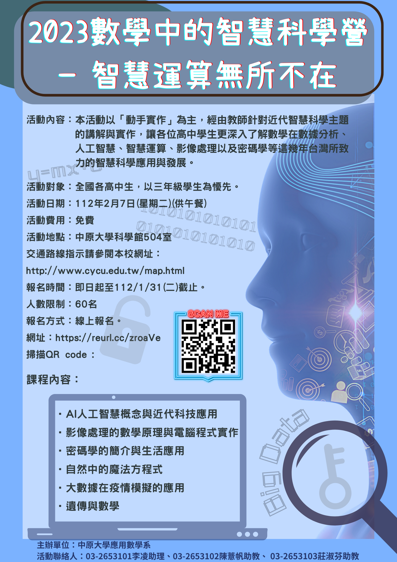 一、本活動以「動手實作」為主,經由教師針對近代智慧科學主題的講解與實作,讓高中學生更深入了解數學在數據分析、人工智慧、智慧運算、影像處理及密碼學等近幾年台灣所致力的智慧科學應用與發展。